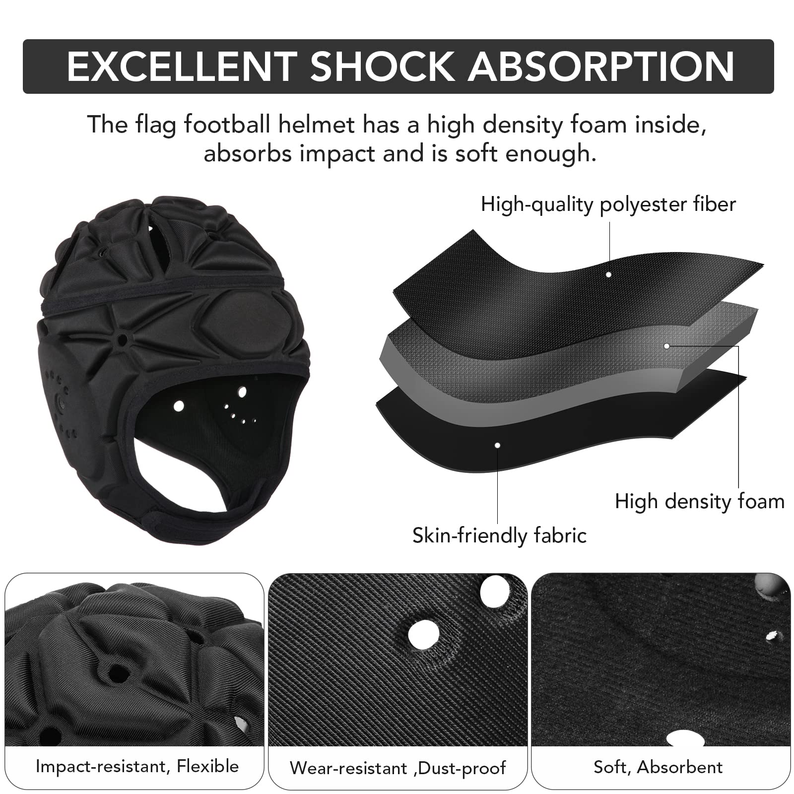 2、Excellent Safety Performance. -- The flag football helmet has a high density foam inside, absorbs impact and is soft enough. The external material is made of high-quality polyester fiber, which is wear-resistant and dirt resistant. Adjustable chin strap and rear laces for easy adjustment.