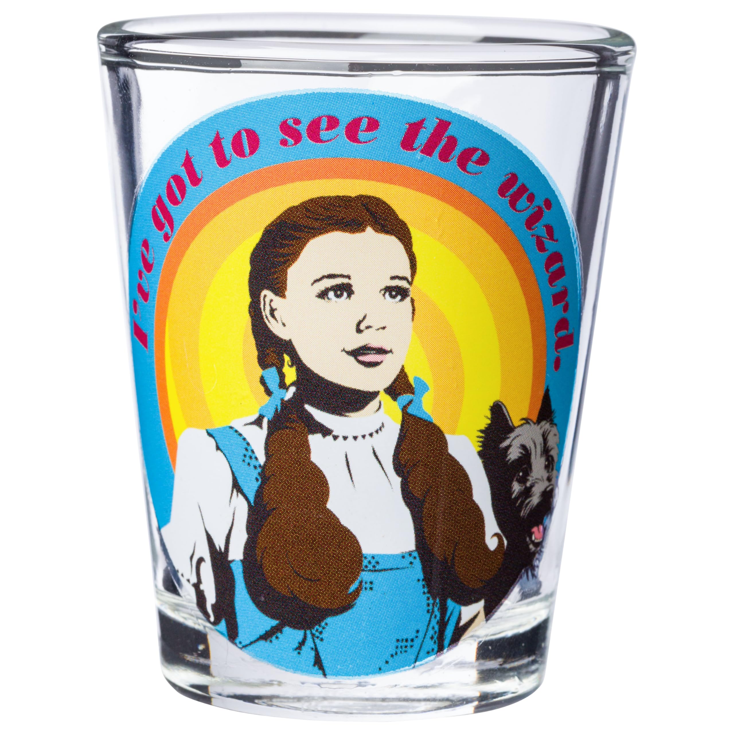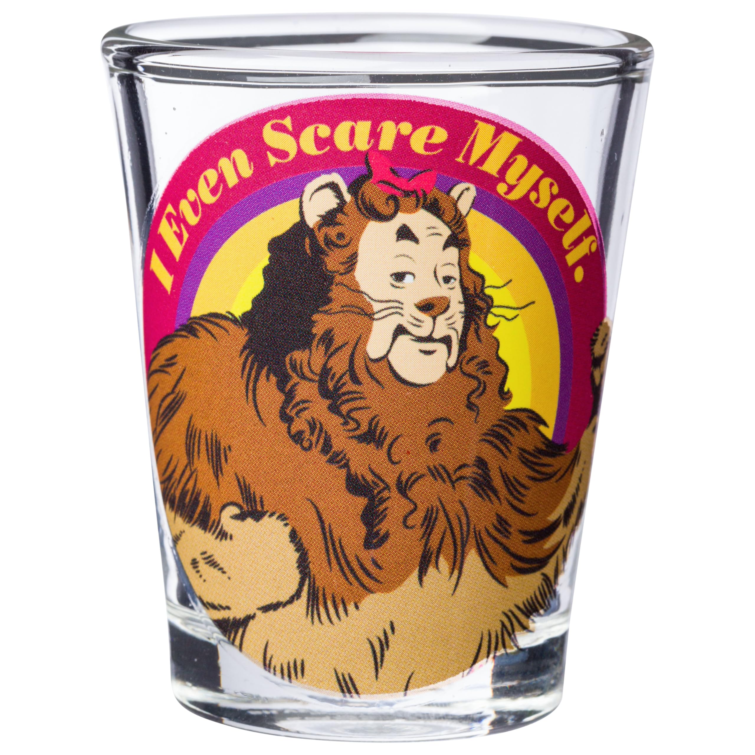 THE WIZARD OF OZ: Mini glass set features four iconic Wizard of Oz characters including Dororthy, Scarecrow, the Tin Man, and Cowardly Lion. Each character is featured on their own glass surrounded by a colorful circular design. Additionally, each mini glass features a quote specific to the character featured.