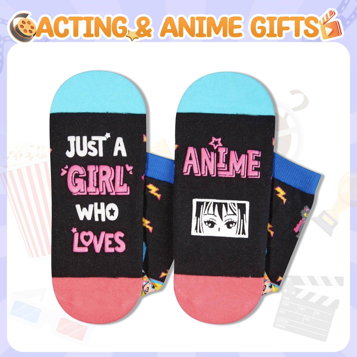 ANIME SOCKS: These socks feature anime characters, cats, ice cream, game machines, and a saying on the bottom that reads, "JUST A GIRL WHO LOVES ANIME."