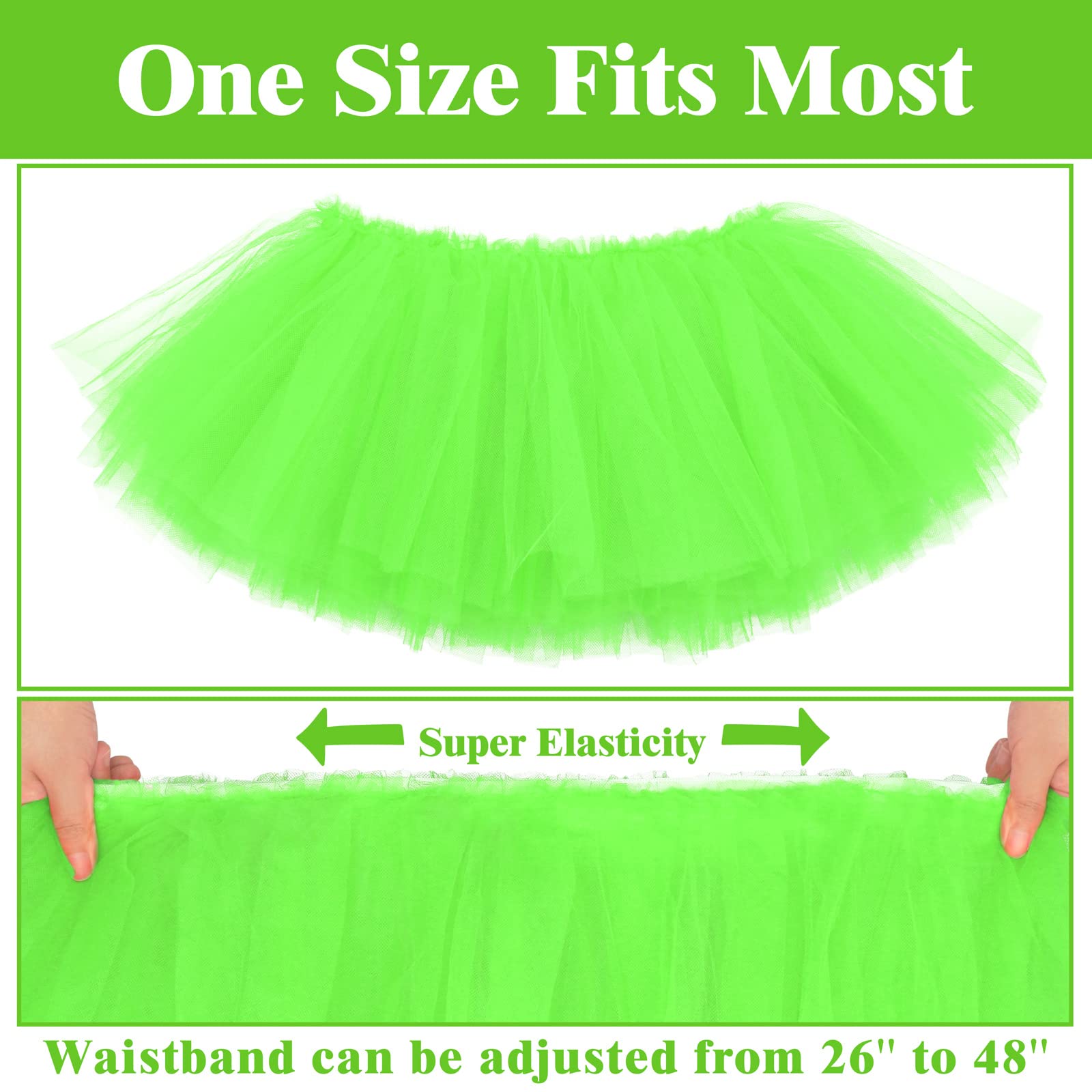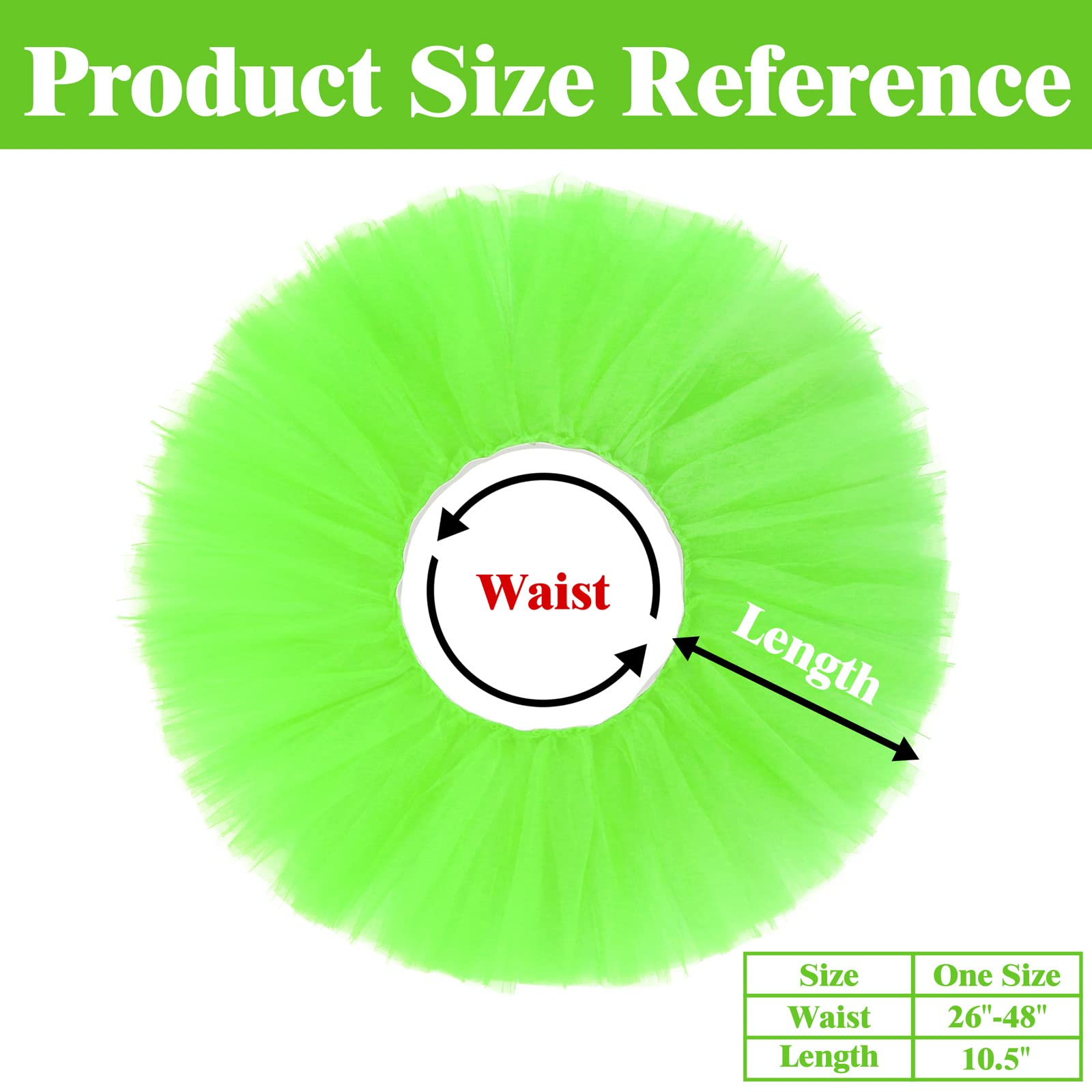 SIZE INFORMATION: One Size fits for most. The adult tutu skirts for women measure about 10 inches in length. And our tutus are designed with comfortable and stretchy waistband, which can be adjusted approximately from 26" to 48" in width. The waist circumference of the tutu is 26'' when not stretched; and due to excellent elasticity of the waistband, the maximum waist circumference can reach 48'' when stretched. The tutu for women is not only durable, but also very easy to slip-on or off.