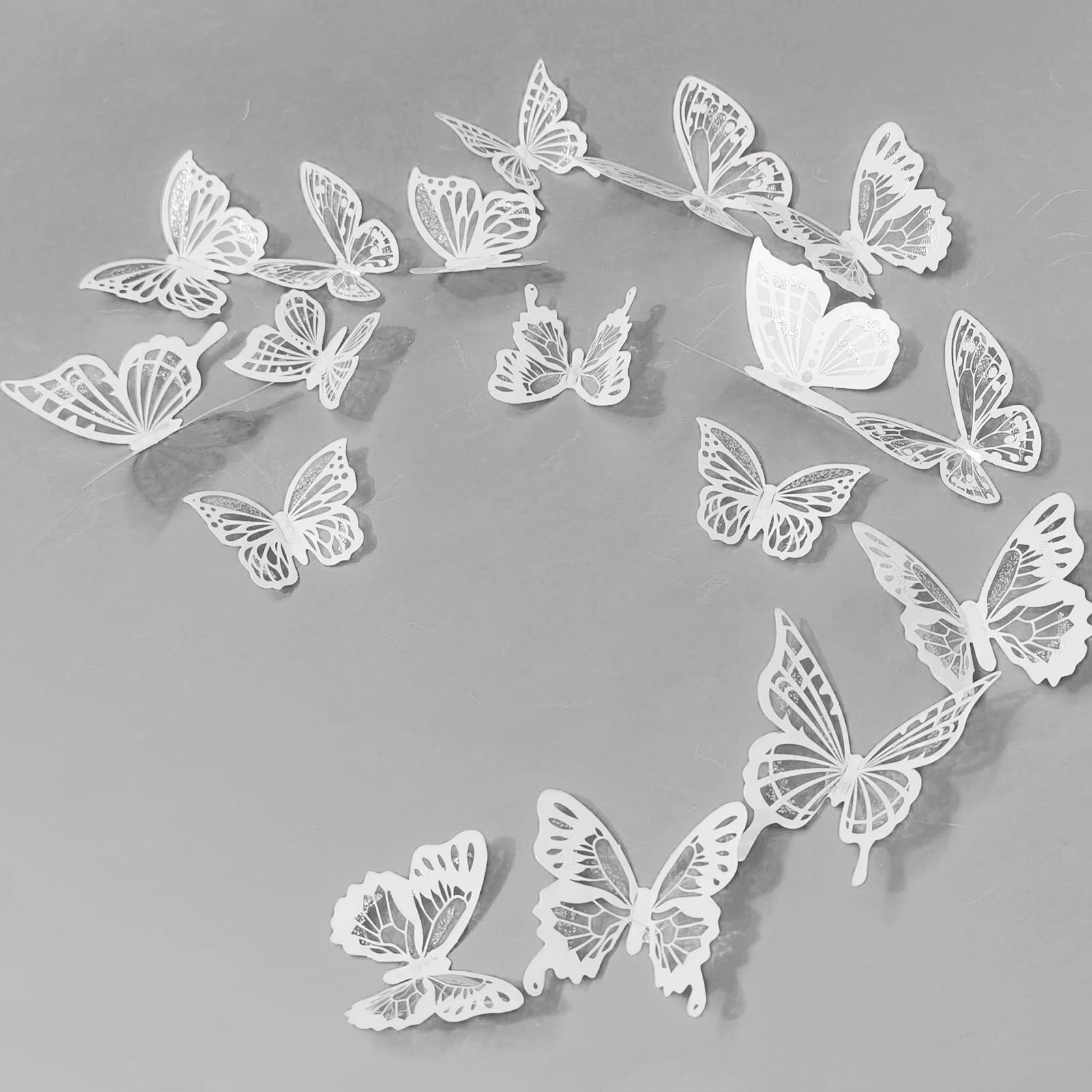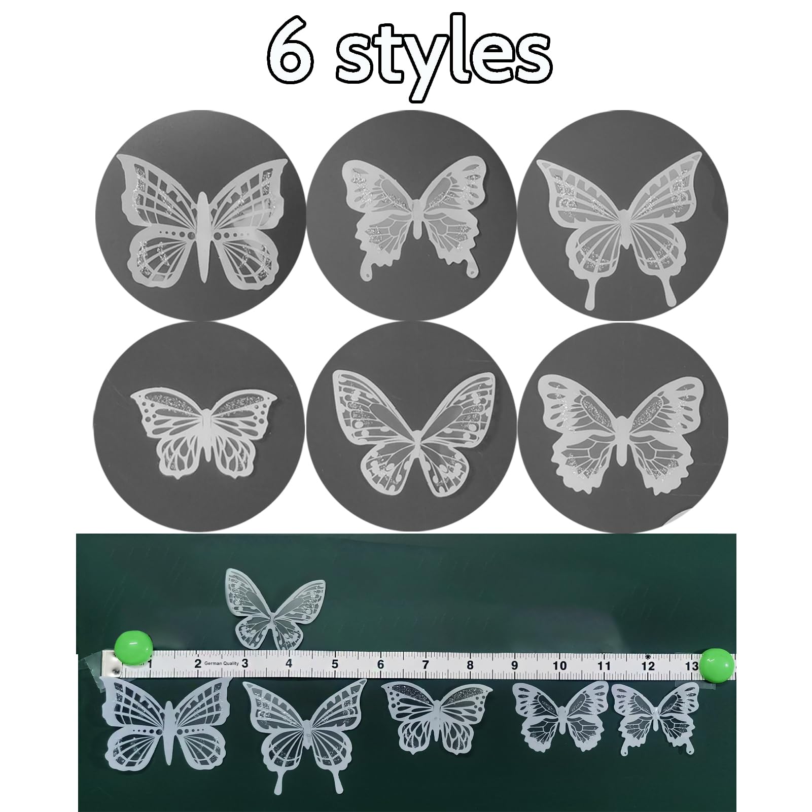 6 STYLES AND PATTERNS: White color scheme with intricate details that make each butterfly cute and vivid. 6 kinds different pattern style vivid realistic wing patterns, showing a fresh and elegant temperament. You can stack two butterflies to form a double winged butterfly, free collocation can show your unique creativity, making the decorative level rich