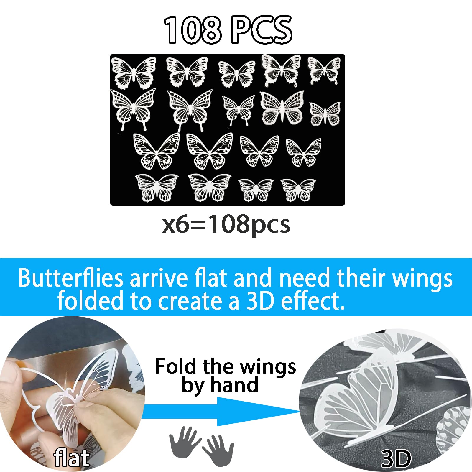 WHITE BUTTERFLY WALL DECALS: 108pcs 3D butterflies wall sticker, 6 style, different size(1.8", 2.1", 2.5", 2.7"). Butterfly home decal decoration 8-12 year old girls bedroom aesthetic, 12-16 teenager girl dormitory. Whether you're decorating baby's nursery, teenager's bedroom or adult's living room, wall decor art craft can DIY any shape you like, white butterfly wall decor will add a touch of whimsy, beauty and sophistication to any space