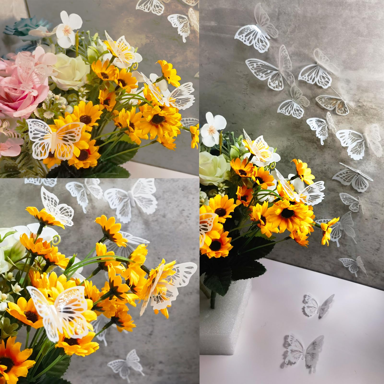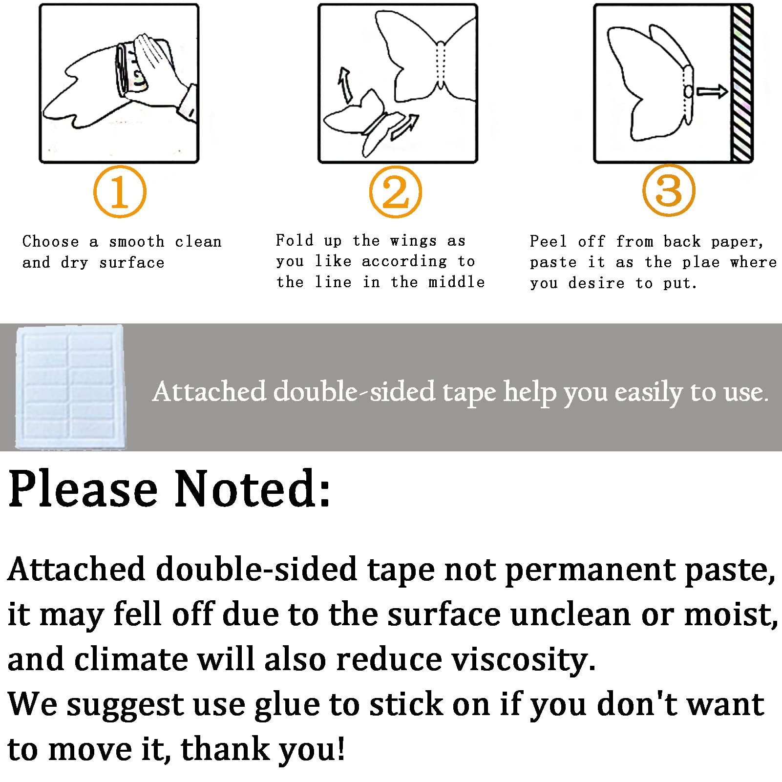 EASY TO USE: White butterfly decoration is flat in the package when you first received, you have to fold the wings slightly to create a 3D effects. Cute butterfly decoration can be affixed on any dry, smooth and clean surface, including walls, doors, windows, mirrors, furniture, laptops or car windows. Butterfly decor set is a combined product, need glue adhesive strip on it before sticking on the wall. You can make their wings lift up and stand on artificial flowers