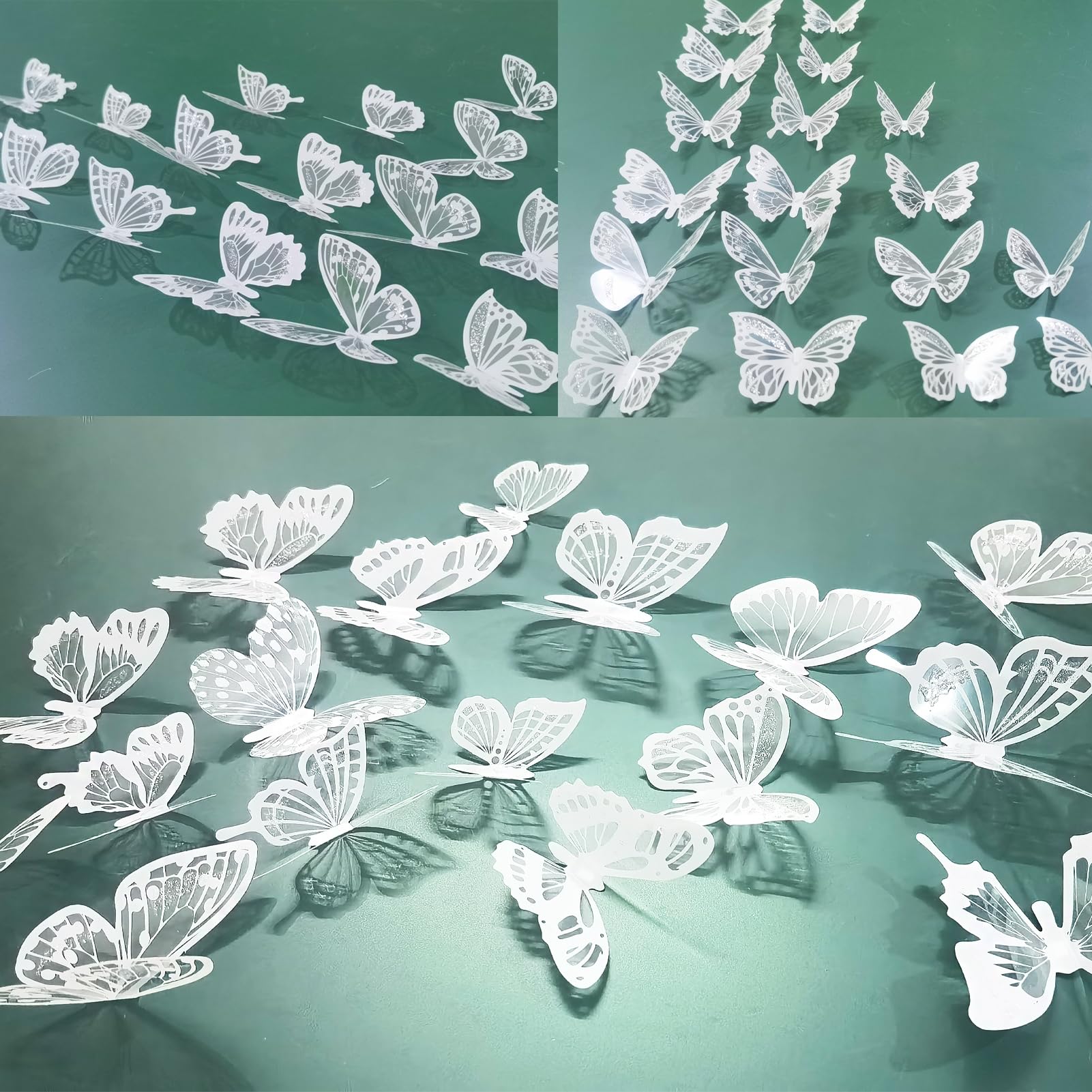 DECORATE MUCH OCCASIONS: Cute white butterfly art can be widely used in various settings, such as home, school, office or commercial space, jungle or spring theme party decor supplies. Bathroom, kid classroom, workroom, garden, girl dorm wall art decoration. Christening, festival celebration, Christmas, birthday, wedding, baby shower, paper flower, butterfly museum embellishment, background, dessert table decor, cake topper or fridge sticker, create a unique and personalized atmosphere
