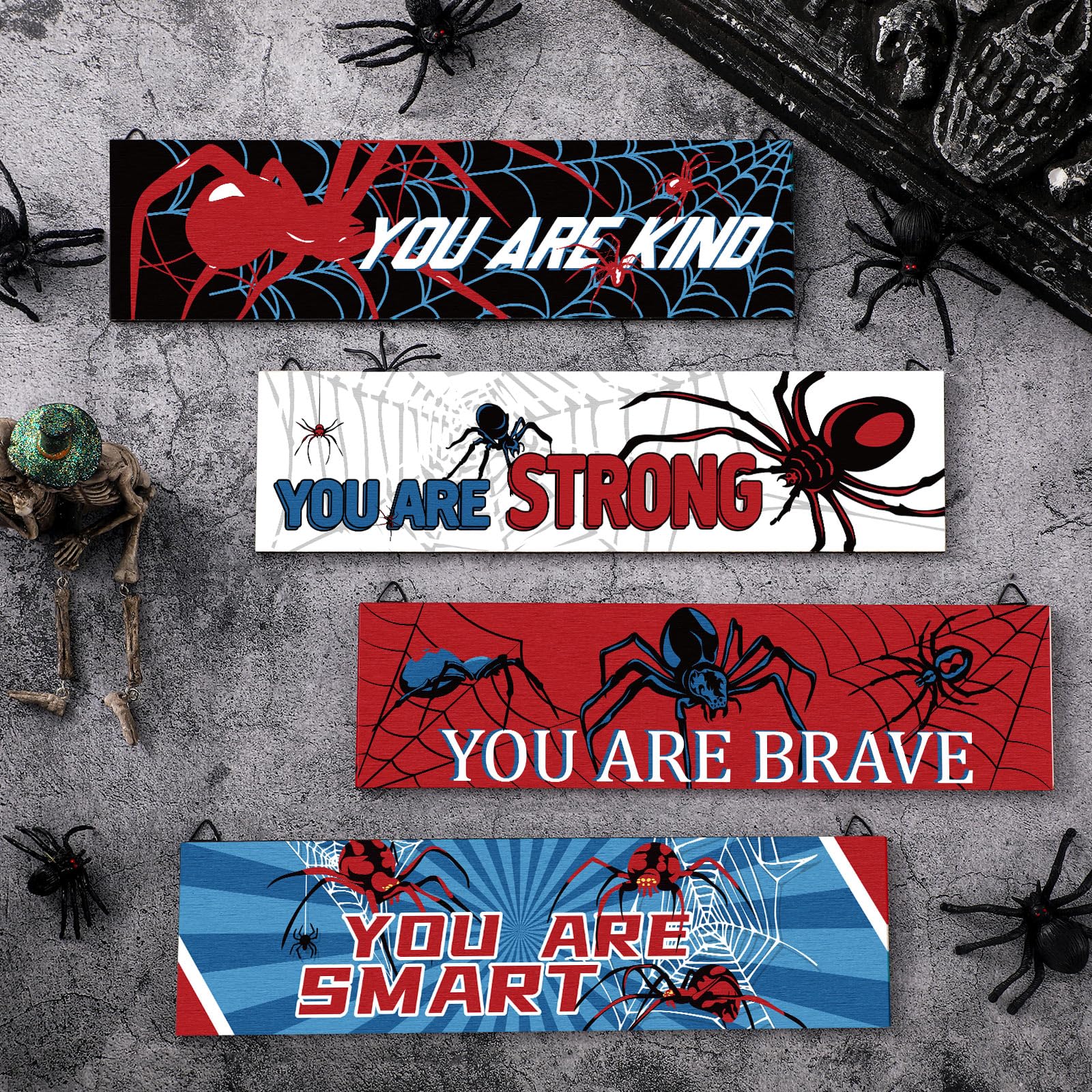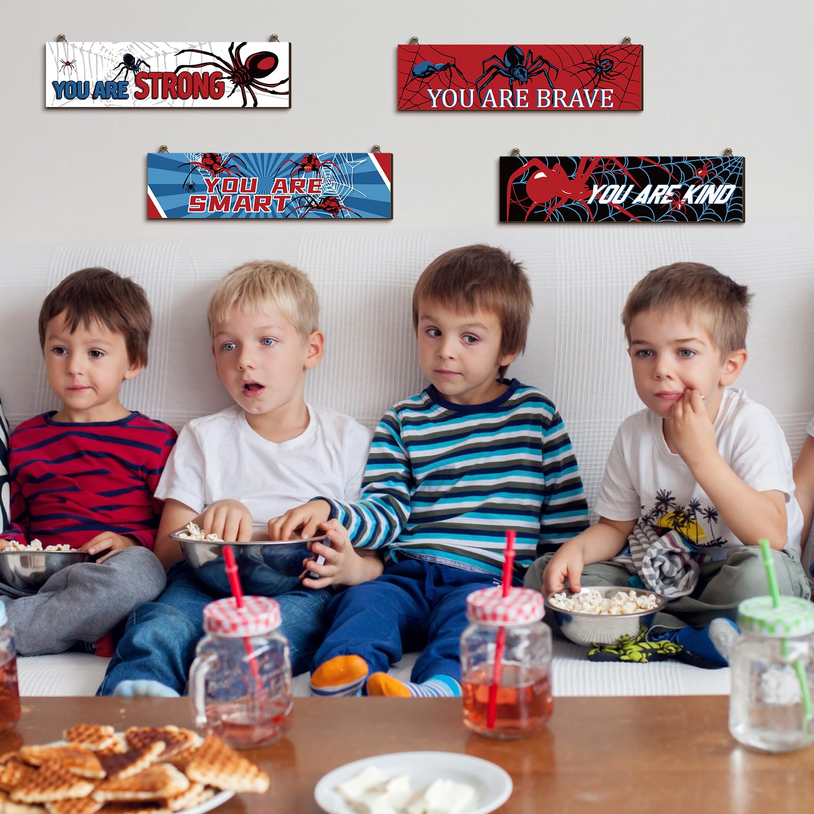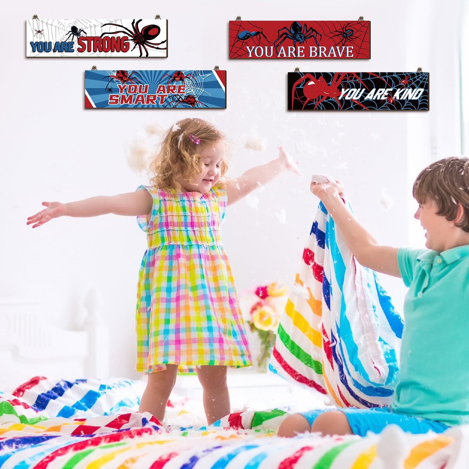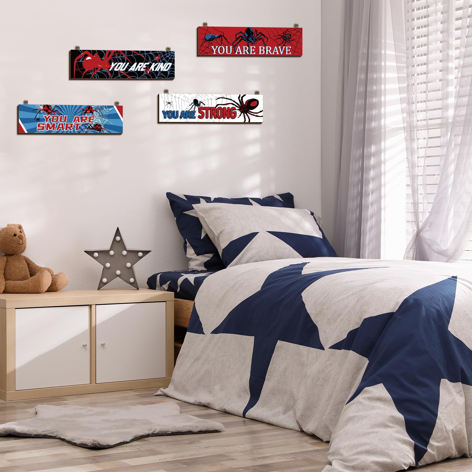 4 Piece Set for Comprehensive Decor: this package includes 4 spider theme sign, each featuring a design; The set allows for various decorating possibilities, either as individual pieces or a collective display, providing a full, comprehensive decoration experience; The equipped hooks at the back make the installation easy, transforming the children's room into their Spider universe in just a few minutes