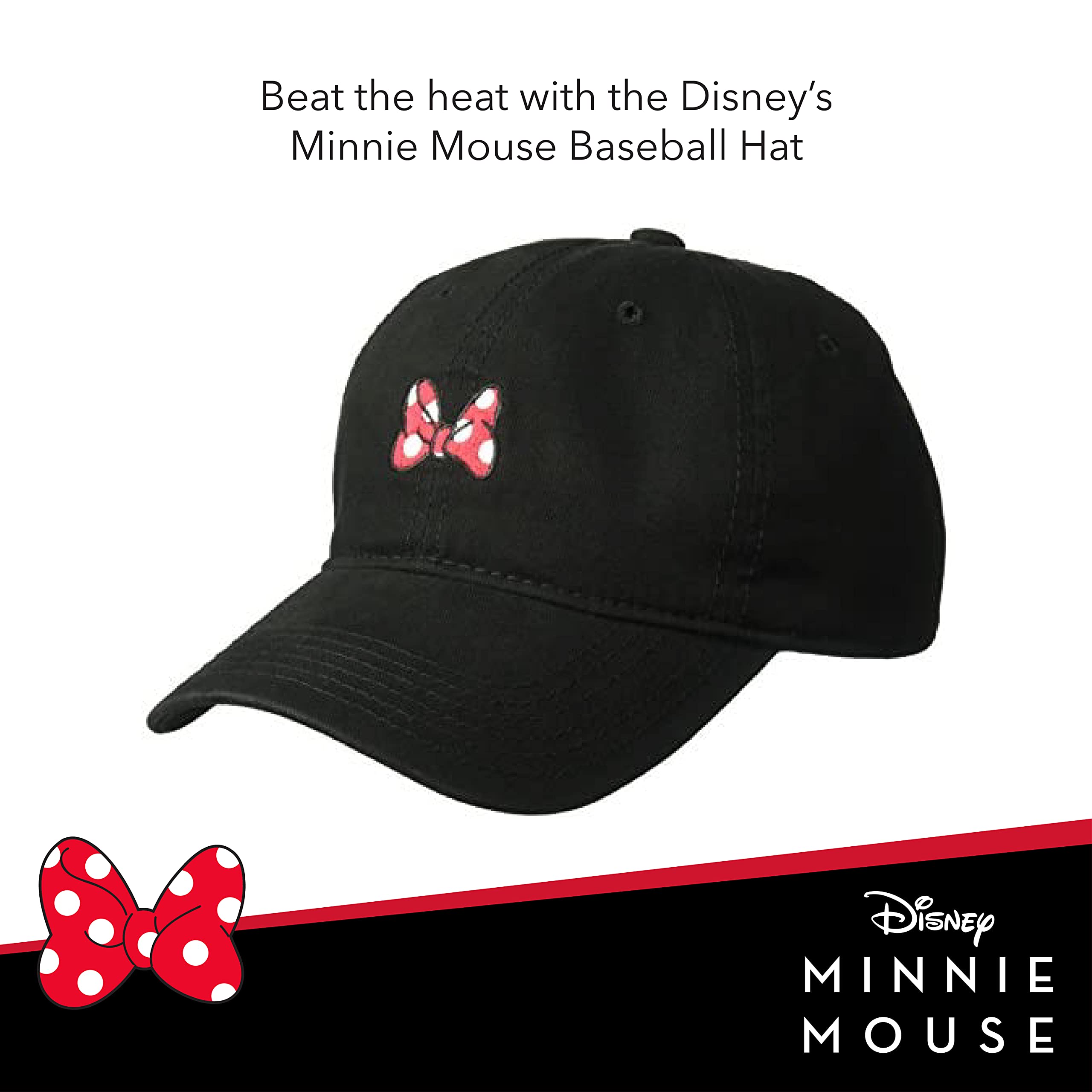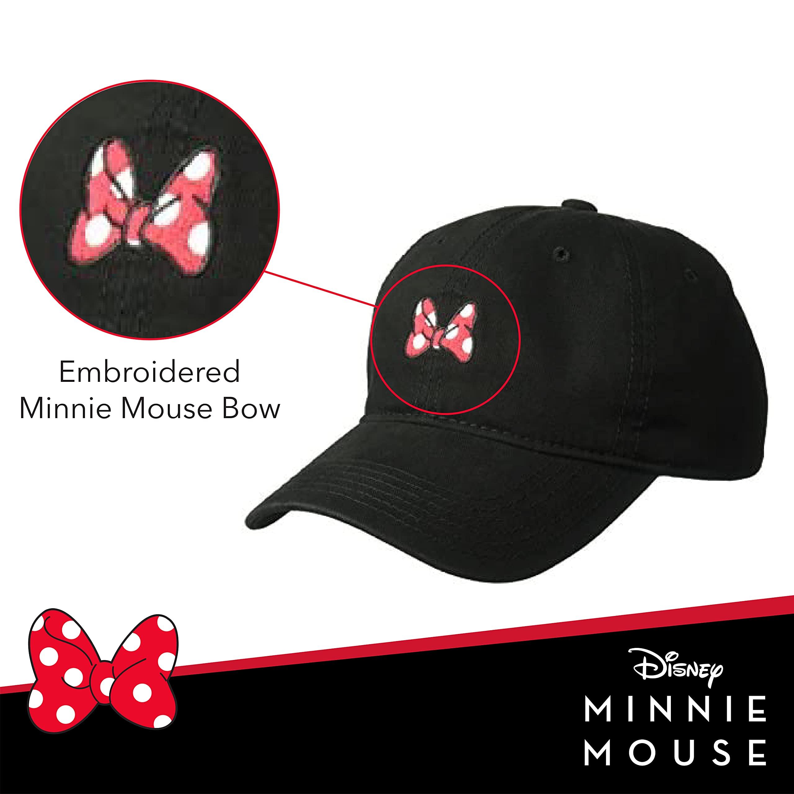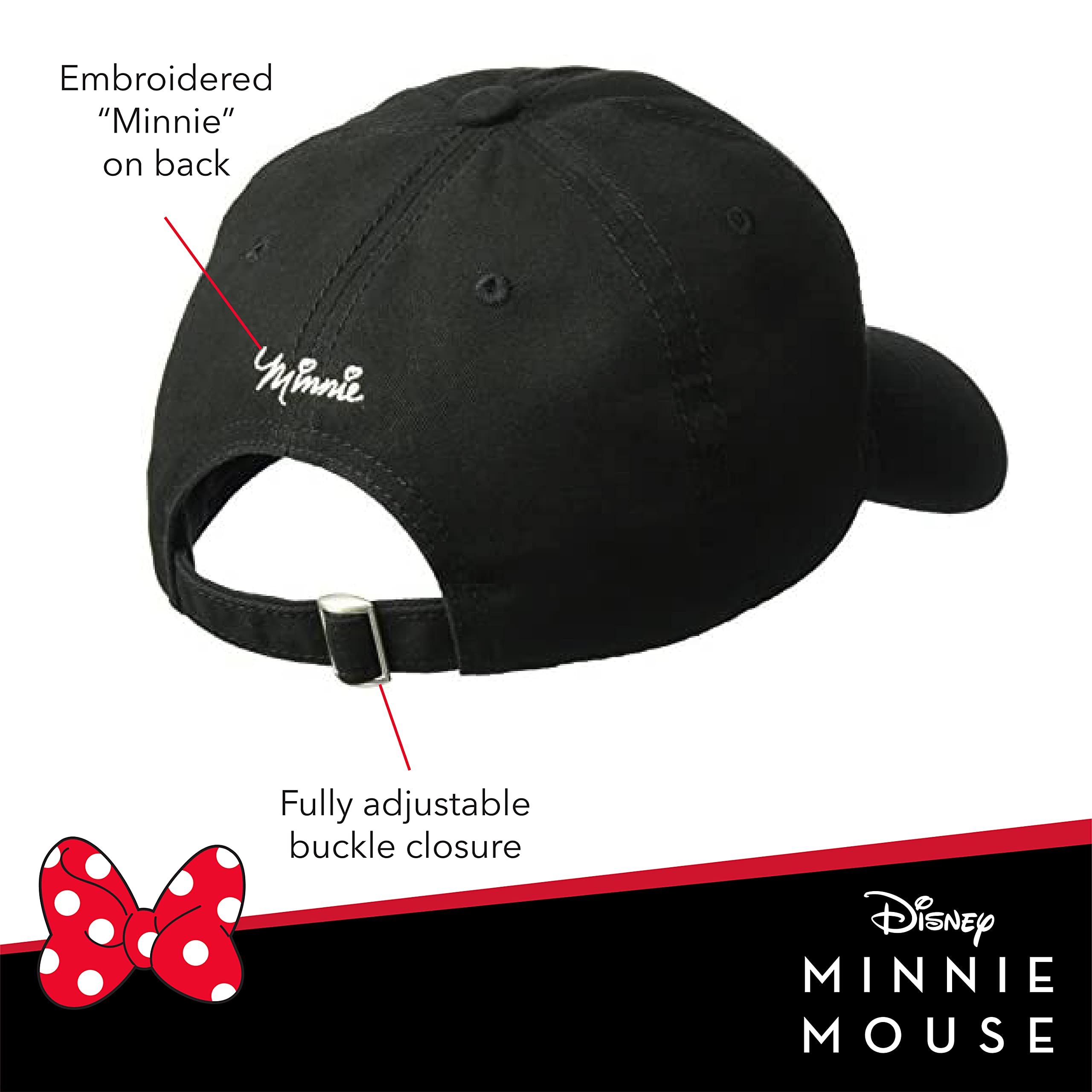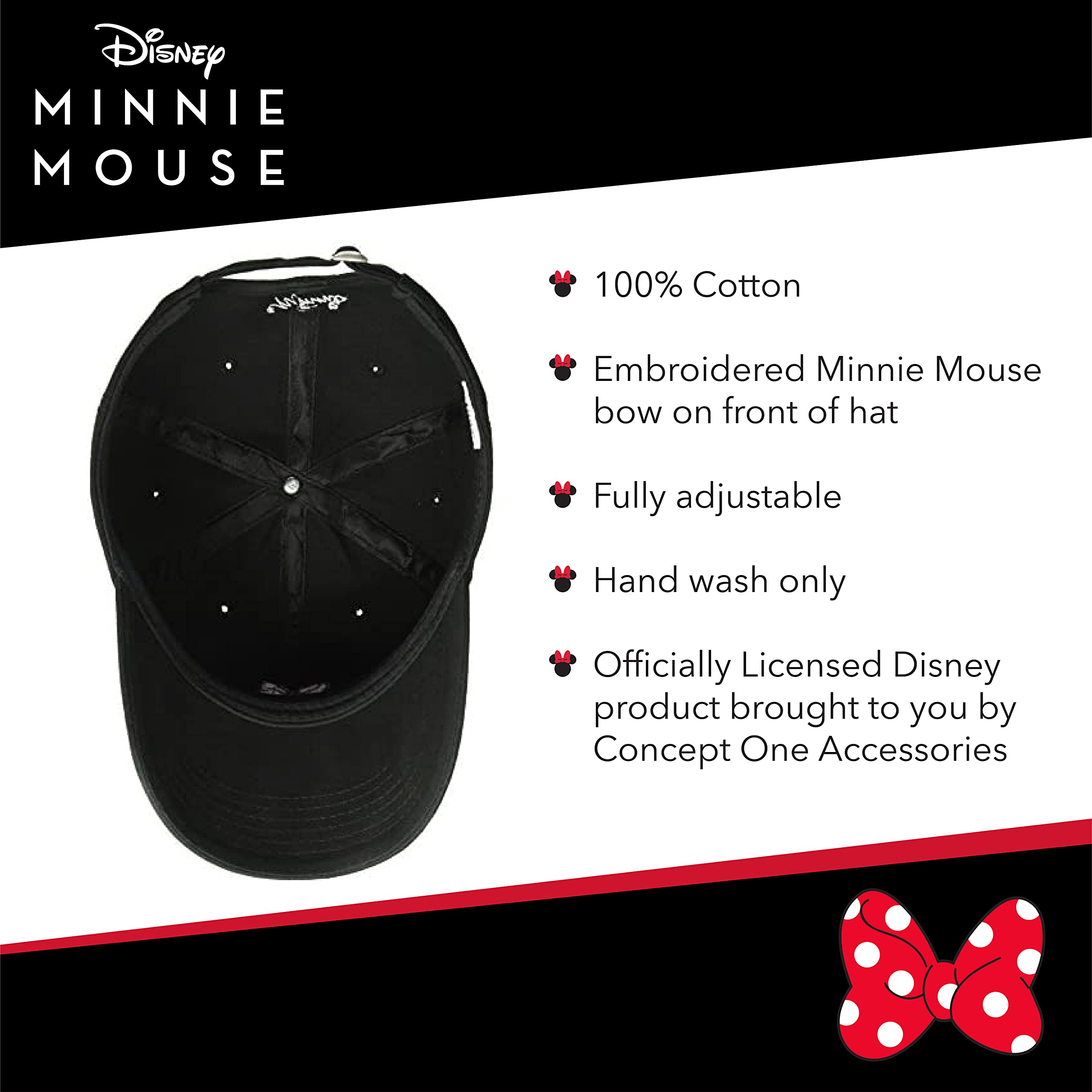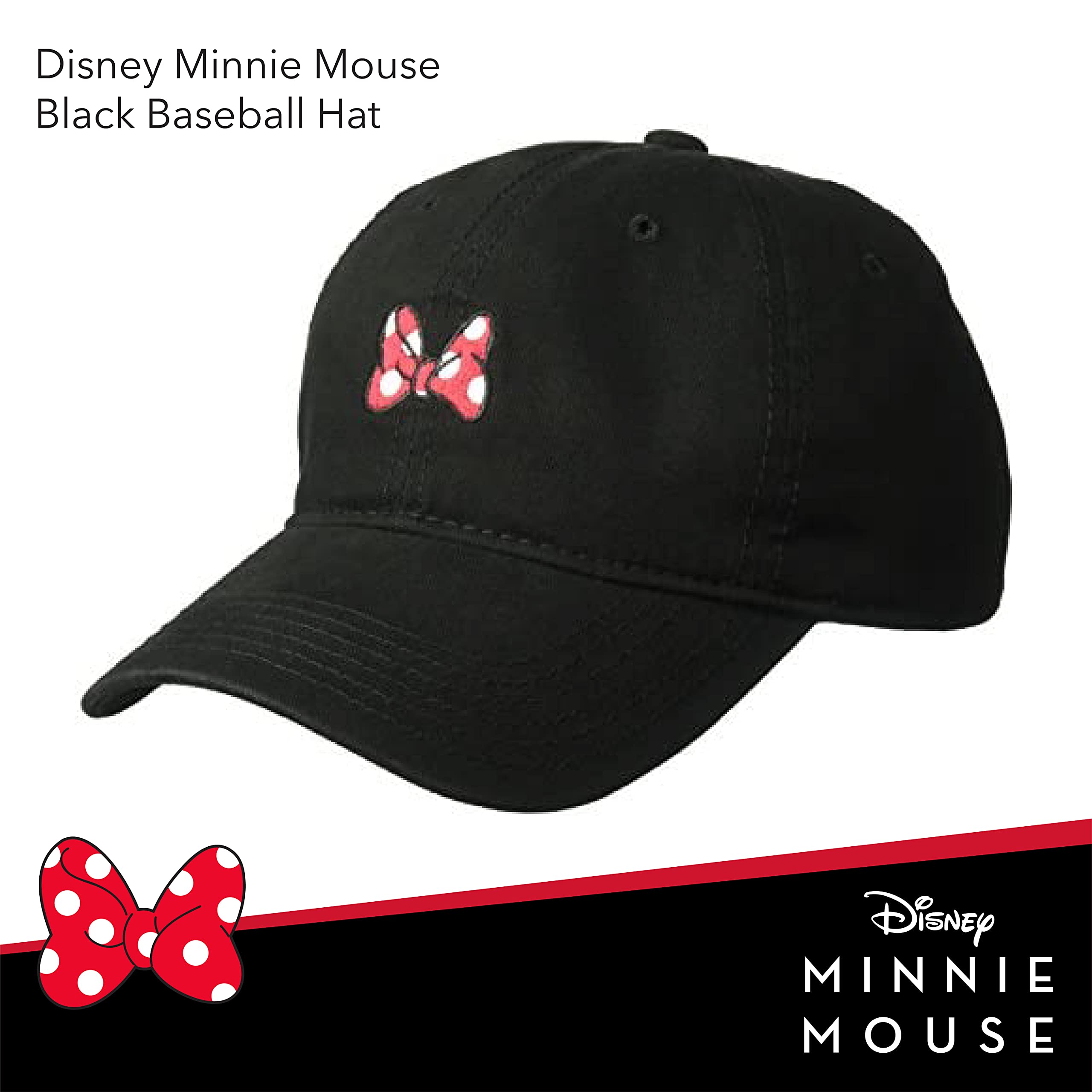 MINNIE MOUSE BASEBALL CAP: Stylish black adjustable hat with an embroidered image of Minnie Mouse's bows on the front of the cap, and a stitched Minnie signature on the back