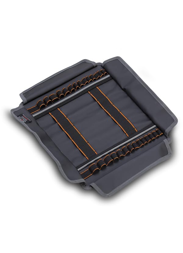 2 center rows of 5 elastic loop for storing socket wrenches and extensions; Flaps along the perimeter that fold inward to prevent items from falling out
