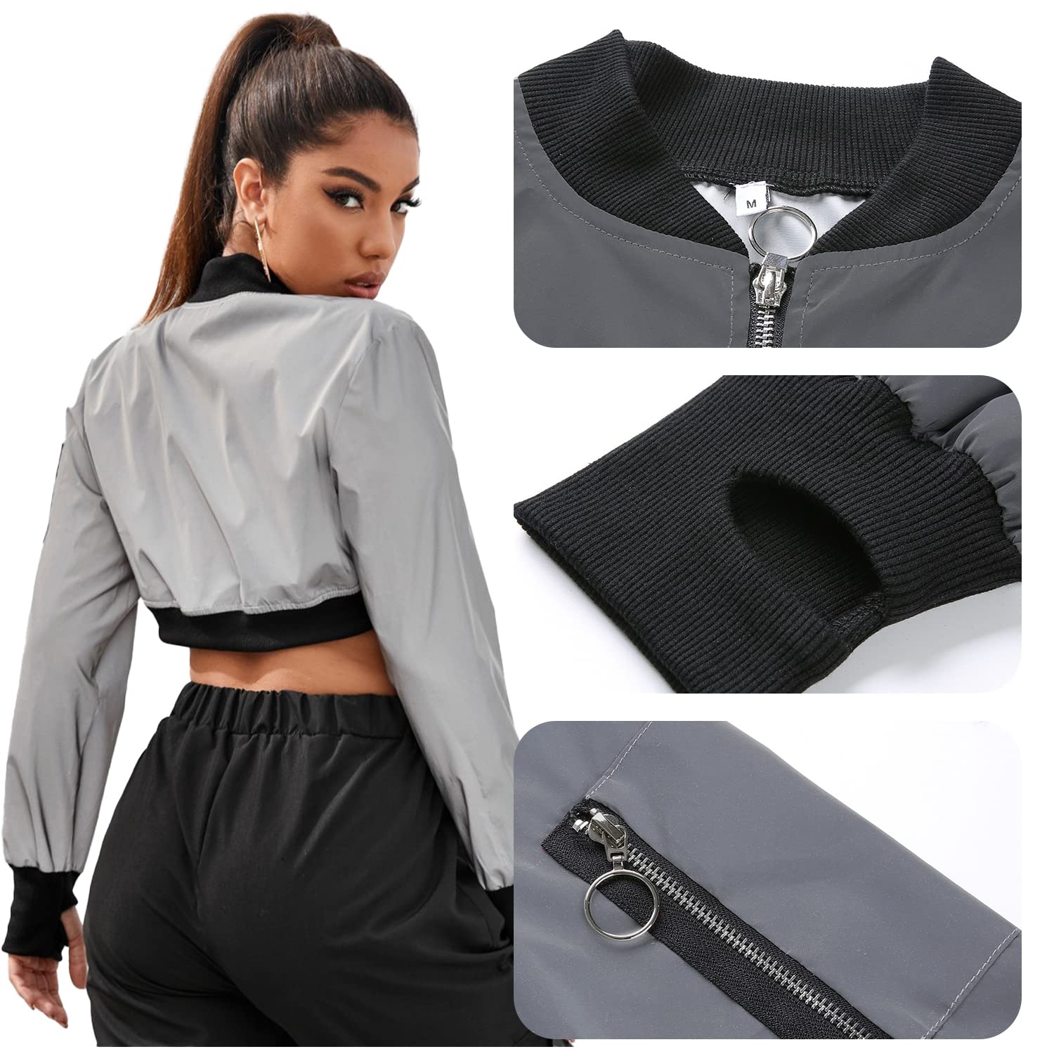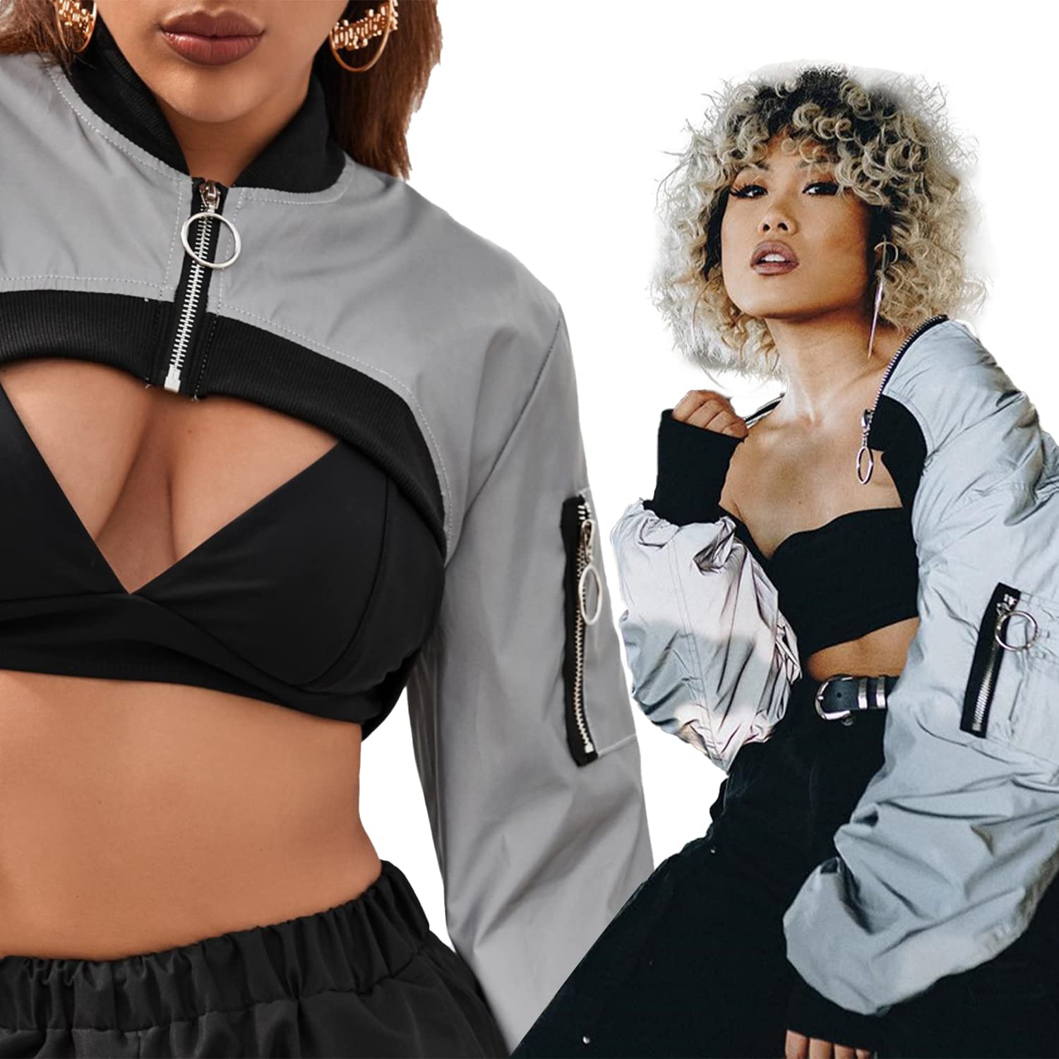 Feature: Zip Up, Pocket At The Side, Reflective Rave Outfit, Cropped Long Sleeve Tops, Loose Fit Alllow Easy Movement.