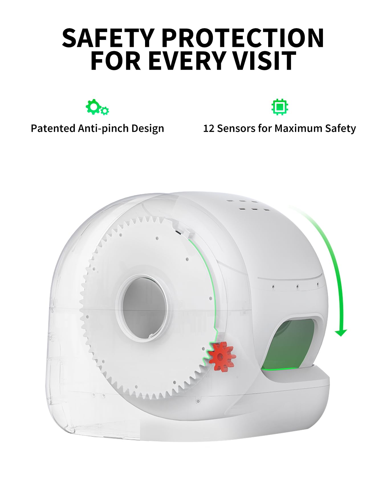 xSecure System Ensures Safety: With high precision sensors ensure the accurate operation and maximum safety. The cylinder stops working immediately upon pet proximity. Additional, the new PETKIT smart cat litter box is designed with anti-pinch structure to keeps the entrance open at all times, prevent cats from getting stuck. Applicable weight range for cats weighing more than 3.3lbs, and over 6 months old.