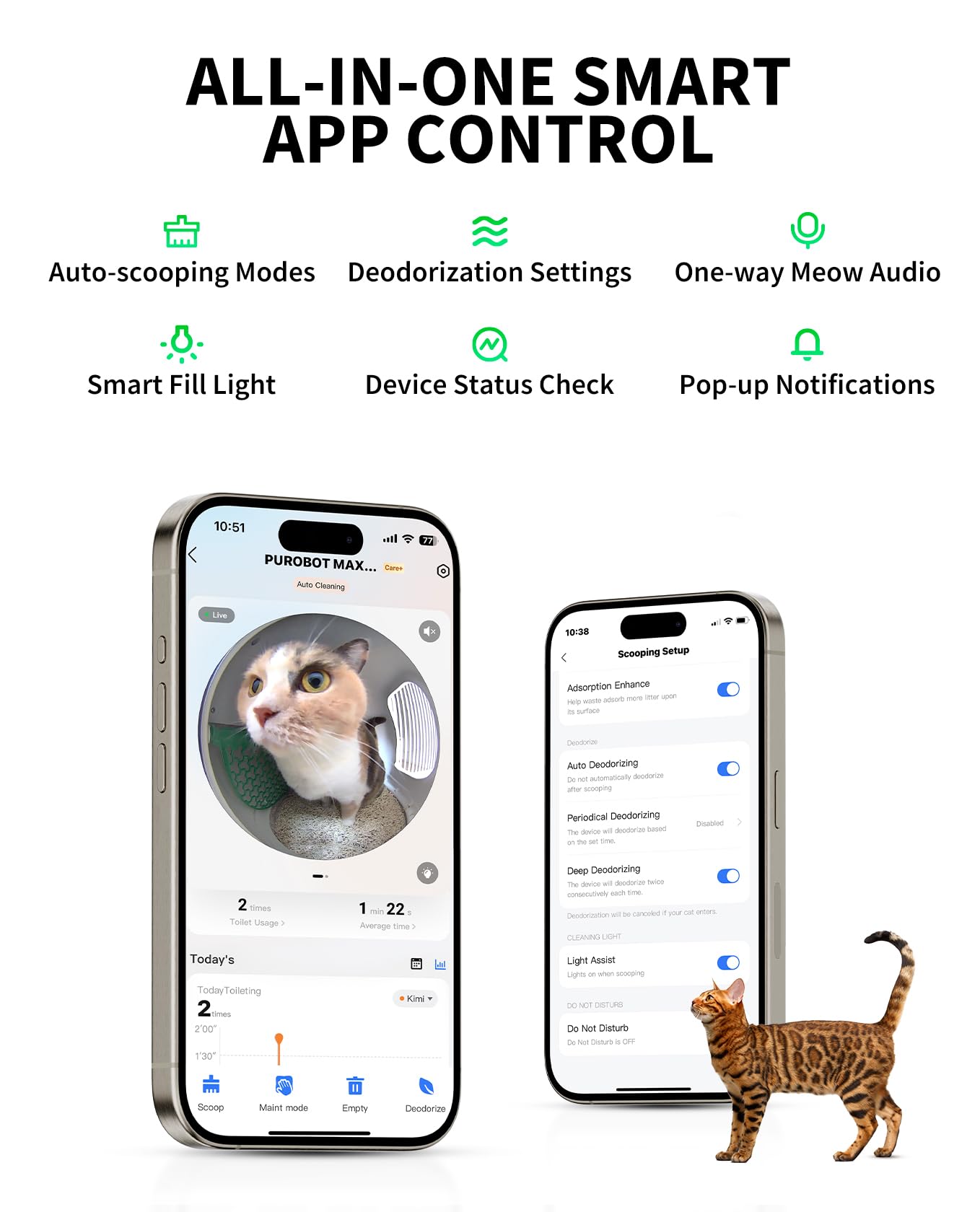 Artificial Intelligence Camera: PETKIT Max Pro self-cleaning cat litter box is equipped with a high-resolution AI camera with 210° wide angle and infrared night vision, which can be controlled remotely and live streamed in real time through the app, with 2.4&5GHz Wi-Fi enabled; the camera comes with a pet identification function, clearly captures the details of the cat's toileting, and focuses on recording the cat's urination and defecation data, help cat owners to determine the cat's health condition and prevent it in advance.
