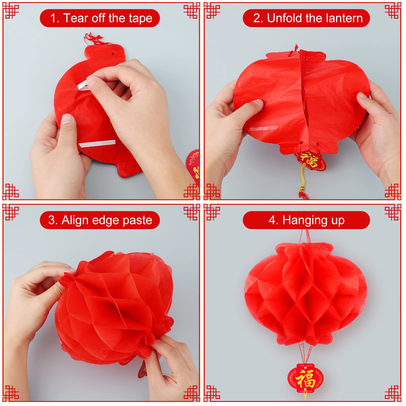 Easy to assemble: each traditional Chinese decoration comes with a wire frame, which is easy to assemble, after using this lantern, you can carefully fold and store it for next use; The red lantern is opened and then pasted together (with a white sticky strip at one end), with a loop and rope on the top for easy hanging and removal
