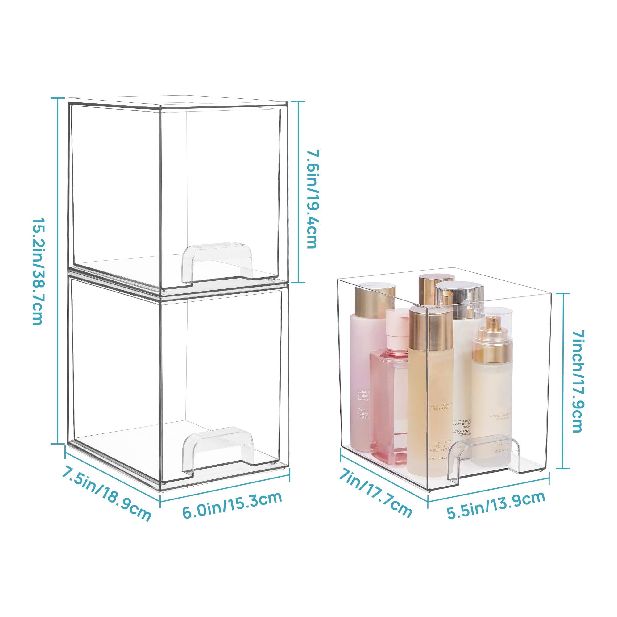 [Stackable Design] Come with 2 drawer storage organizers, each organizer measures 7.5"D x 6"W x 7.6"H. Vertical storage will save a lot of space. You can put other objects on top of acrylic bins to make your countertop and cabinet space more tidy. It can also be stacked with Vtopmart storage drawers of other sizes.