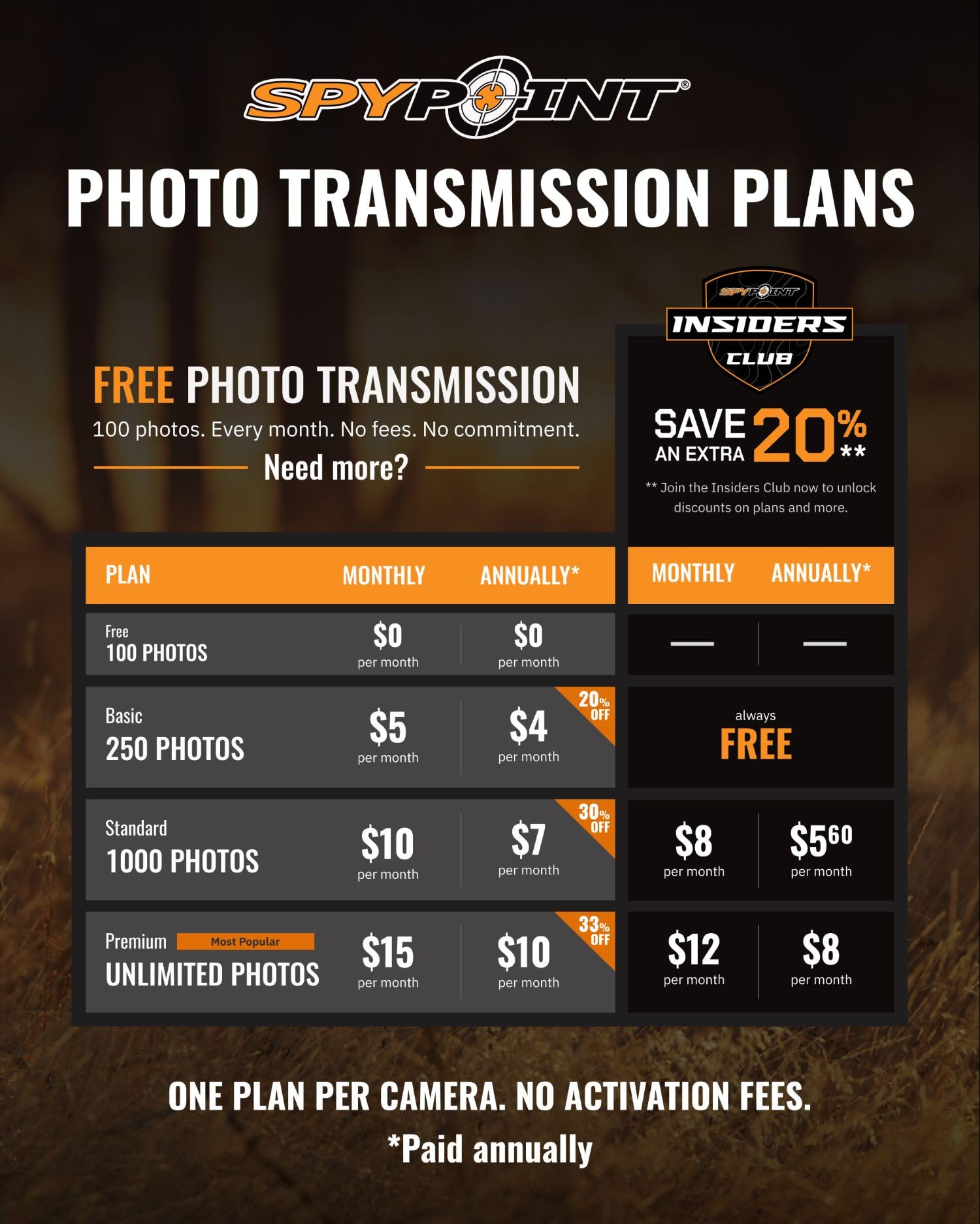Enjoy SPYPOINT's FREE PHOTO TRANSMISSION PLAN! Transmit up to 100 photos per month with no fees and no commitmentโit's the only free plan for cellular cameras. Need more? Paid plans start at $5/month for 250 photos or $15/month for unlimited. Choose monthly or annual billing with no activation fees. One plan per camera. Plus, join the Insiders Club for extra savings!