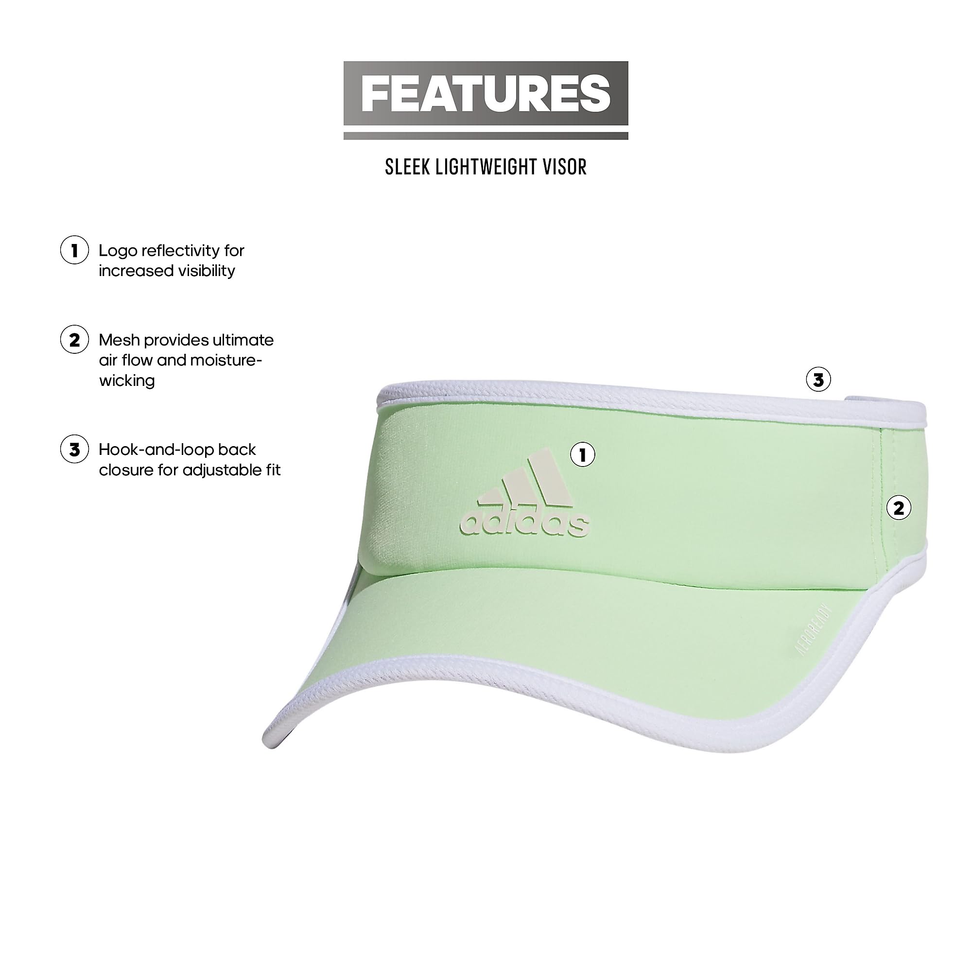 Description Run or train in comfort. This adidas visor is made of lightweight fabric for a barely-there feel. Mesh panels move heat and moisture away from you. The non-glare undervisor helps you see without squinting. With reflective details.