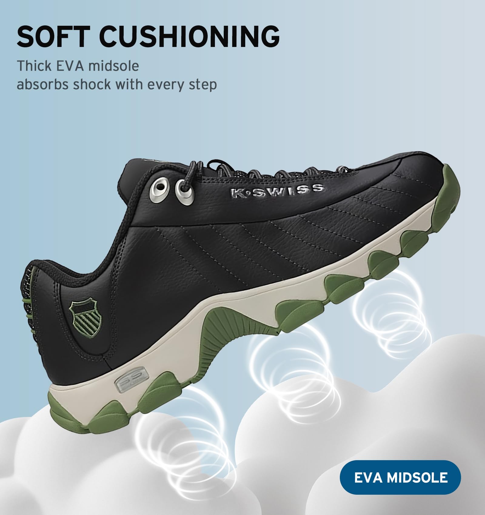 Description The St329 sneaker was the original tennis training shoe developed by K-Swiss, and has since become a cult-classic. Designed and built to last, this staple sneaker showcases a durable rubber outsole, sturdy tread, and maximum comfort with a k-eva cushioned midsole and premium memory footbed. Designed and built to last, this staple sneaker showcases a durable rubber outsole, sturdy tread, and maximum comfort with a K-EVA cushioned midsole and full length premium memory footbed.