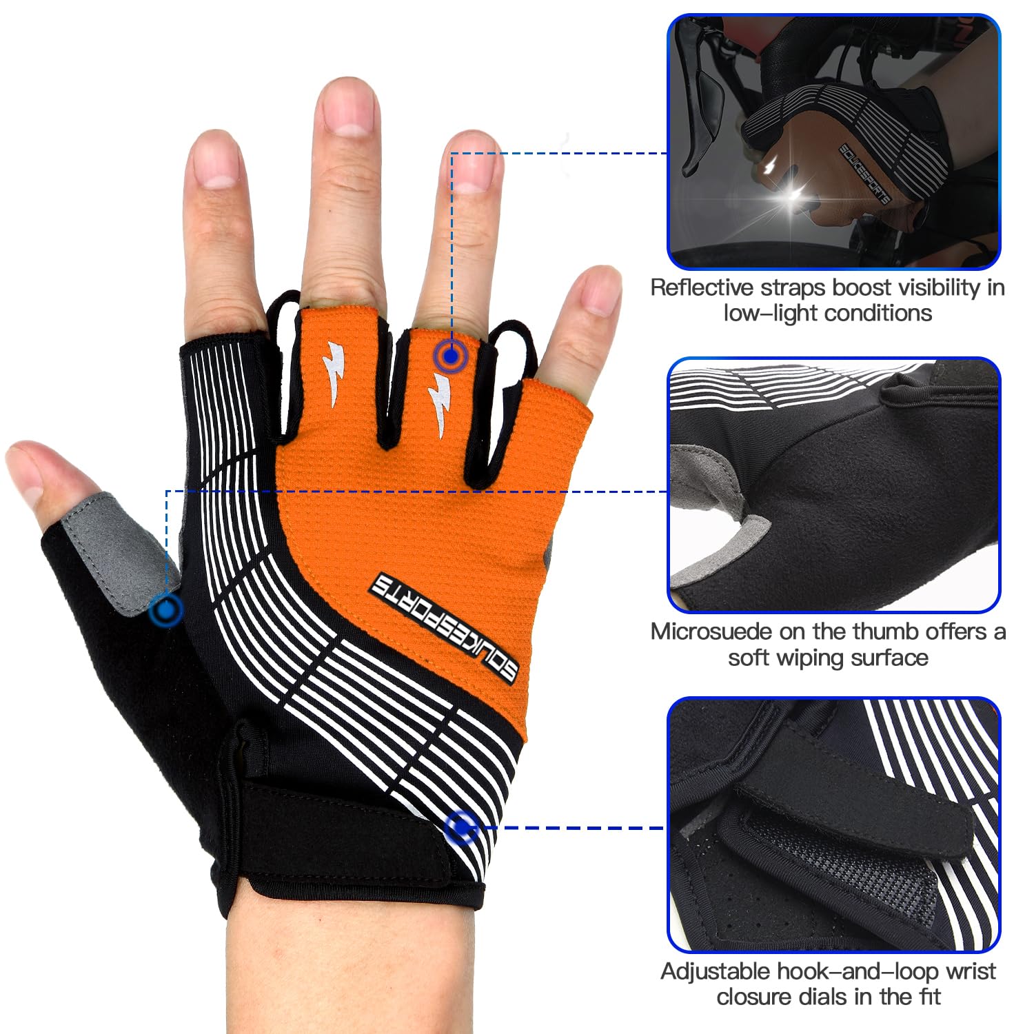 Performance Features: These mens bicycle gloves offer many of the features found in more expensive gloves.The Velcro closure ensures a good fit and Two finger loops and a pull tab on the bottom make for easy removal. Wiping surface on thumb helps clear sweat from your brow mid-ride. And multiple reflective details increase your visibility to motorists in low-light conditions.