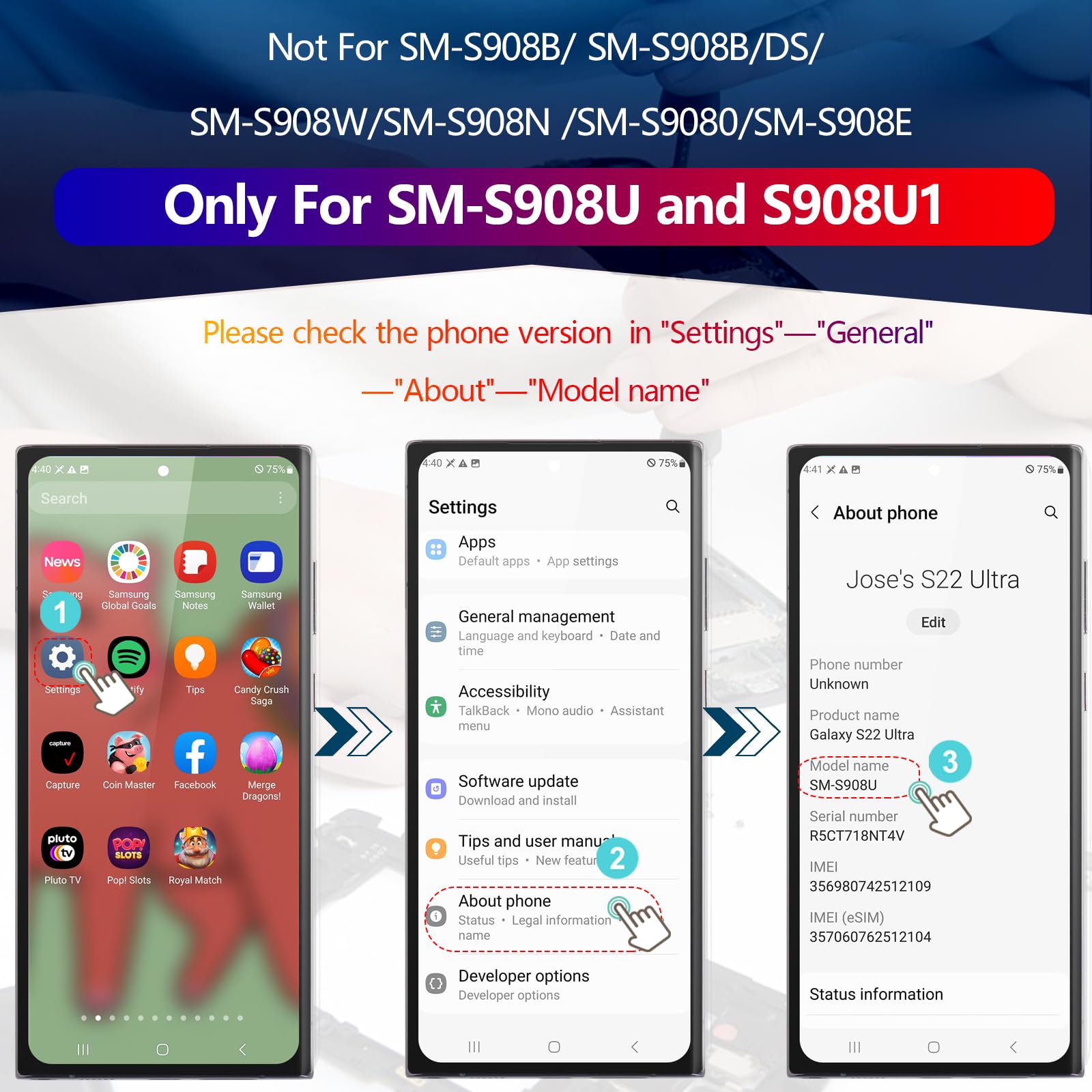 Compatibility: The Black USB charging port only for Samsung Galaxy S22 Ultra 5G USA Version SM-S908U SM-S908U1 replacement.(Not For SM-S908B/ SM-S908B/DS/ SM-S908W/SM-S908N /SM-S9080/SM-S908E.) Please make sure your phone model before purchase.This product only for Samsung Galaxy S22 Ultra dock connector replacement, not include other phone accessories. Please transfer them from old screen. How to confirm Phone Version: Settingm About Phone, Phone Model.