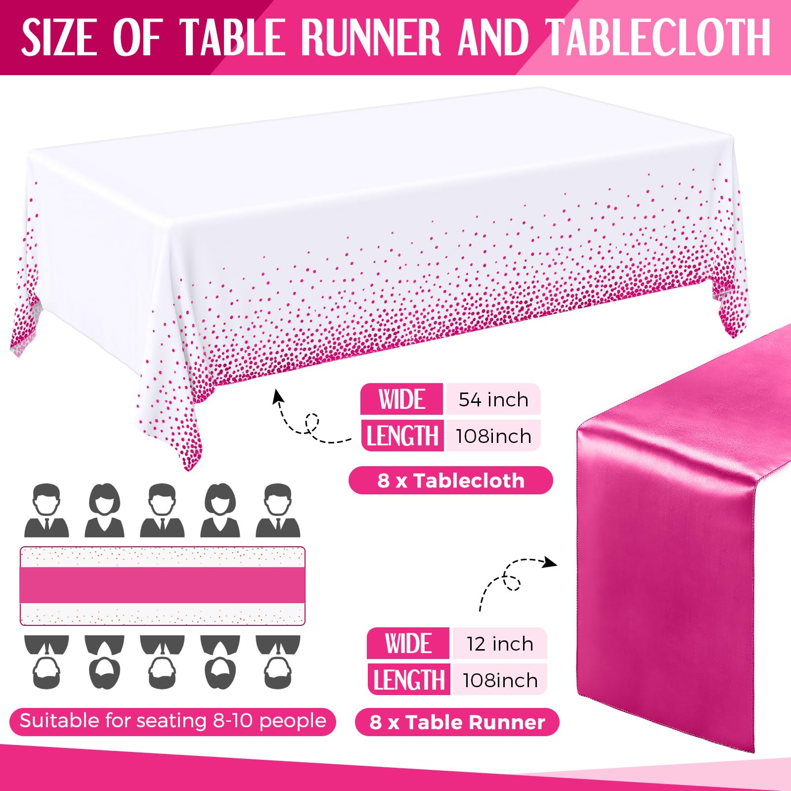 Sufficient Quantities: what you will receive are 16 packs of table covers, containing 8 pieces of plastic tablecloths and 8 pieces of satin table runners; Besides, the sets of table decorations can reduce your selection time and meet your replacement needs