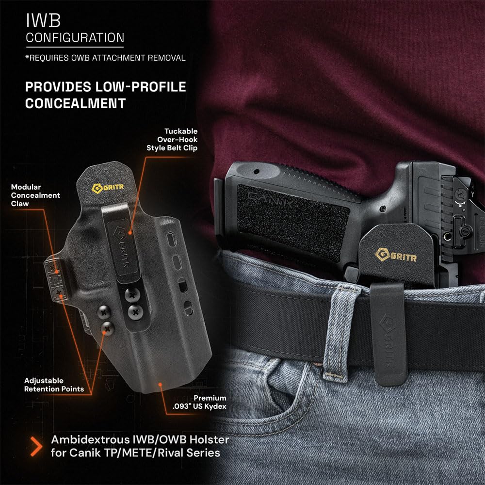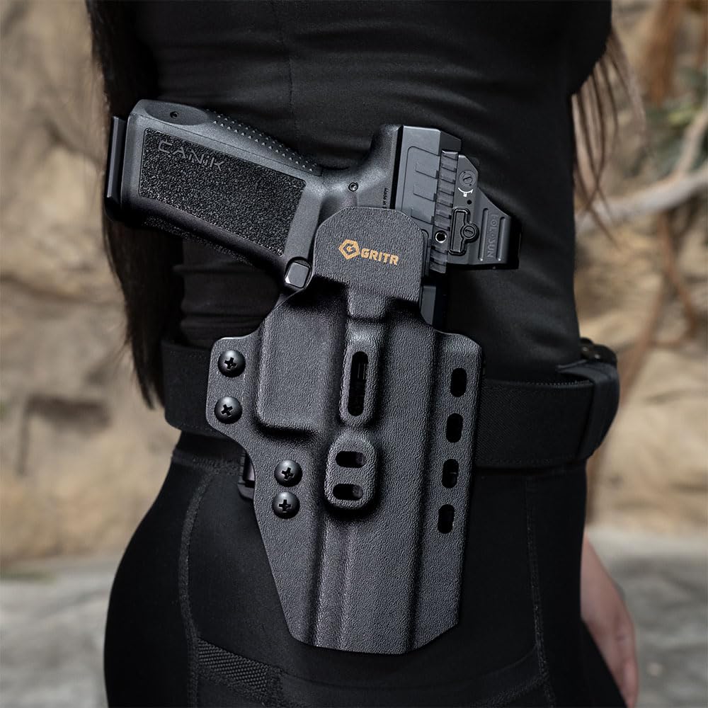 FIREARM COMPATIBILITY: This GRITR OMNI holster was precision formed for the Canik TP9 series, METE series & RIVAL series (does not fit the METE MC9 Prime model), and is not compatible with light/laser mounted models; This GRITR open/concealed carry handgun holster is formed with premium duty grade .093 US Kydex that is waterproof, sweatproof, hand-washable and lightweight; This firearm accessory is suitable for range training, tactical shooting applications, competitions, and everyday carry