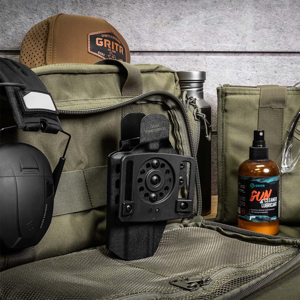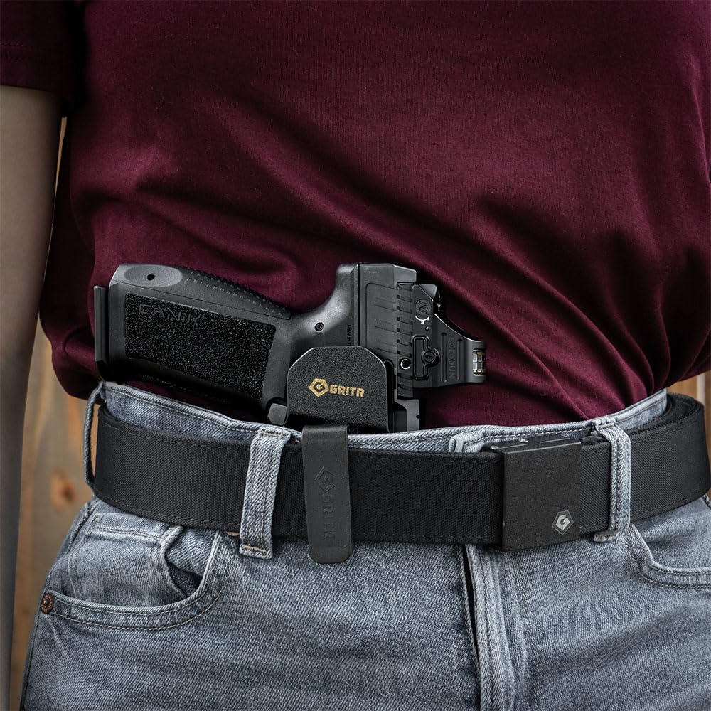 PERSONALIZED CUSTOMIZATION:This EDC pistol holster features multiple retention adjustment points, an optic cut and open muzzle to accommodate various red dot sights, threaded barrels and aftermarket compensators; The OWB attachment of the GRITR gun holster is adjustable for belts up to 2-1/4"; The 1.5" IWB attachment is tuckable and both OWB/IWB attachments allow users to adjust the cant and ride height