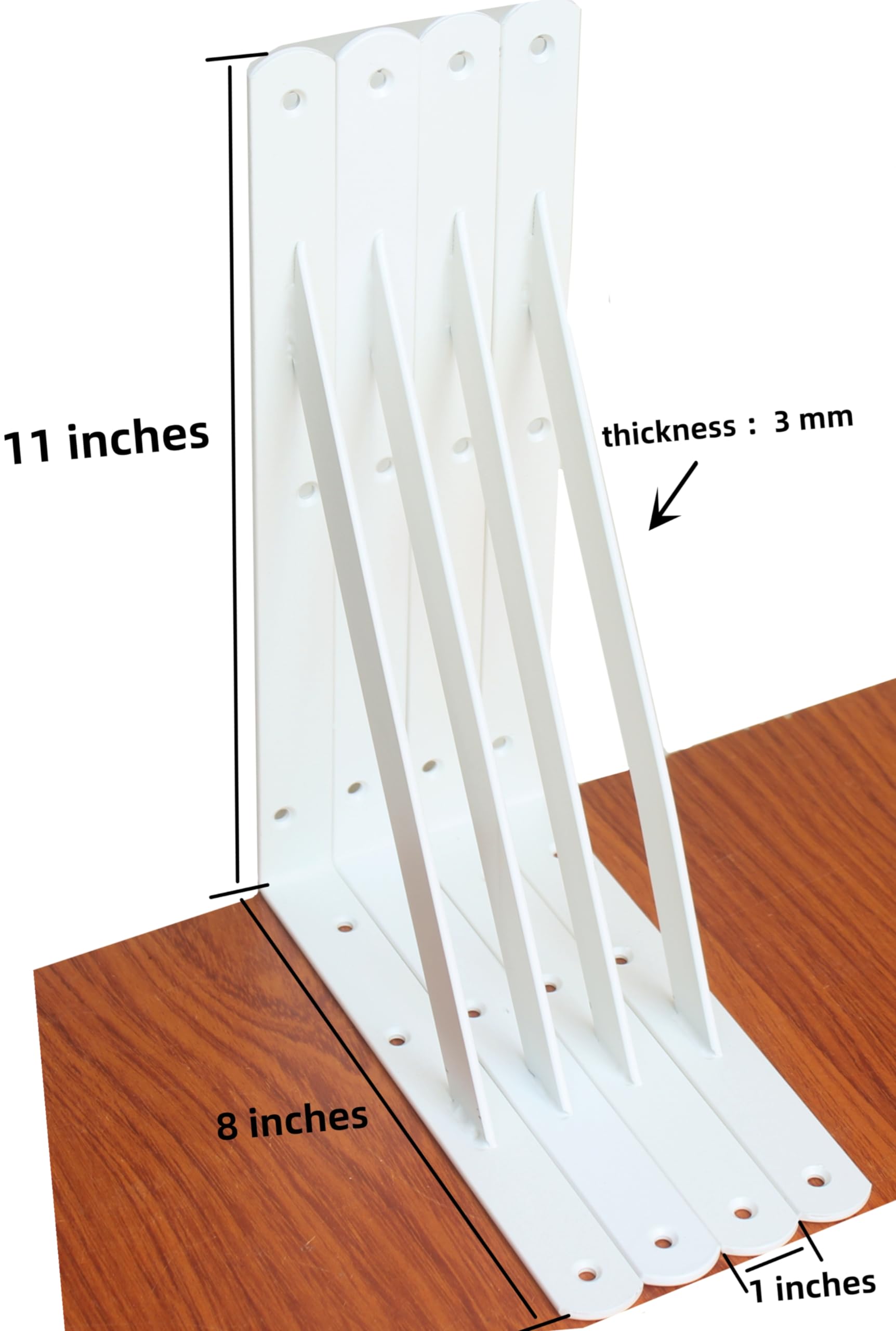 Size:L 11" x H 8" x W 1", 3mm Thick. Package included: 12 x Brackets , 36 x long Screws, 36 x short Screws(Wood plank is Not included)Our floating shelf brackets come with 12 brackets for your wall mounted shelves.Our heavy-duty brackets can support Audio Equipment,bookshelf,kitchen ware,electric power tools , TV bench ,farm tools,etc.