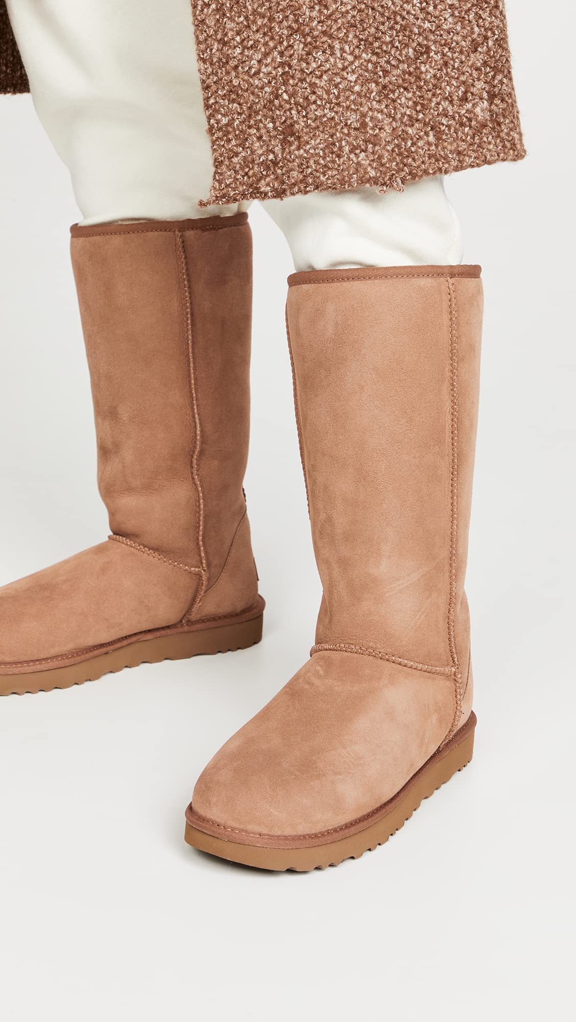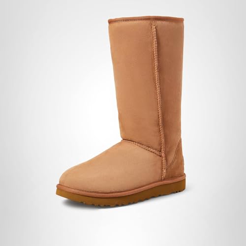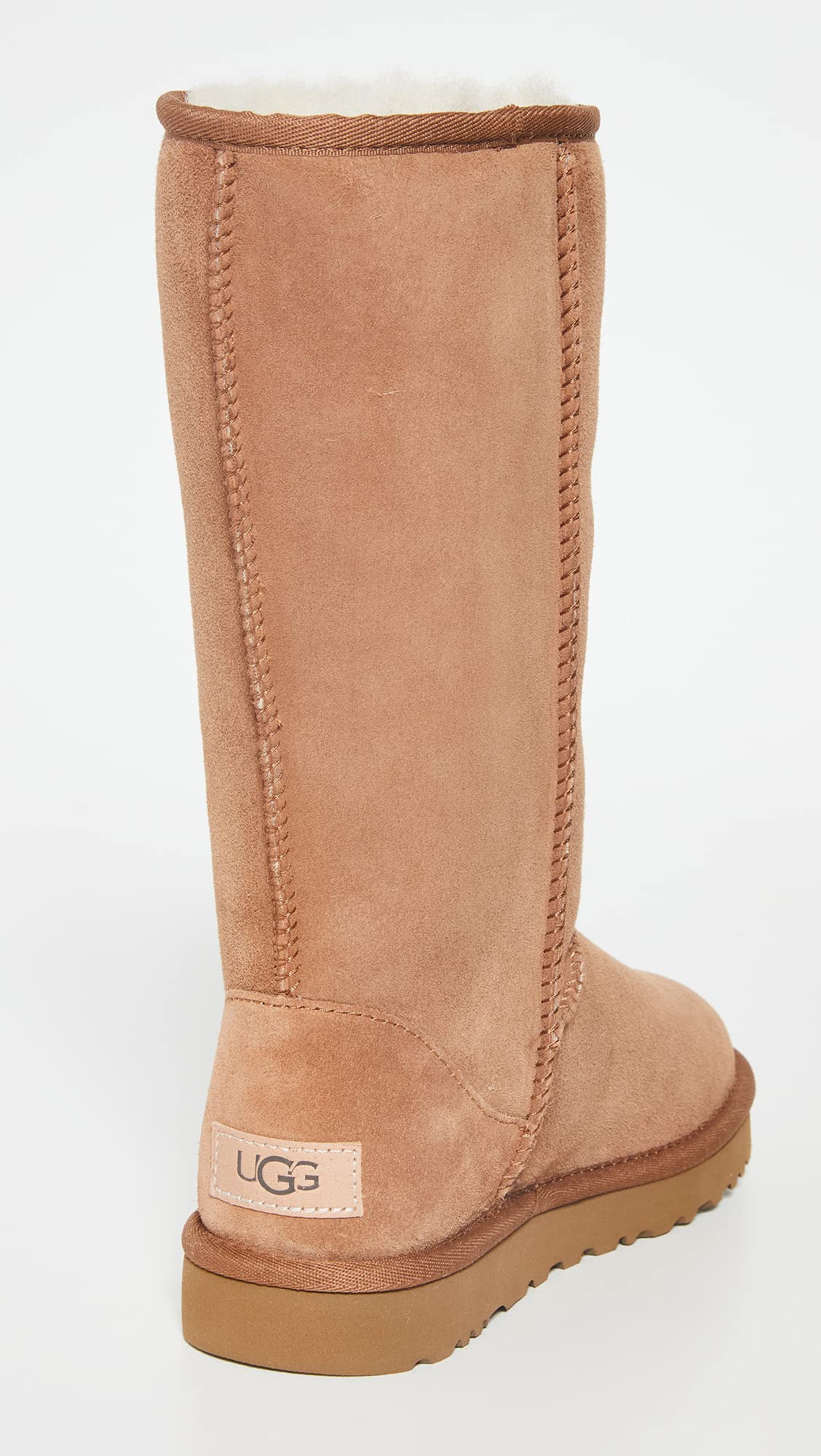Description Our Classic boot was originally worn by surfers to keep warm after early-morning sessions, and has since become iconic for its soft sheepskin and enduring design. The Classic II Tall features two new updates: a pretreated exterior for stain-and-water resistance and a lightweight sole to increase cushioning, durability, and traction. These versatile boots pair well with practically anything – try a flowy floral dress, a silk slip, or loose boyfriend jeans and a velvet top.If you are unsure which shoe size to purchase, please follow the following steps:1)Draw a straight line, longer than your foot, on a piece of paper.2)Place the paper on a flat surface. Stand on the line with your heel and longest toe centered on the line. If measuring a child's foot, it may be easier to hold the paper up to their foot.3)Place a mark on the line at the tip of the longest toe and at the back of the heel.4)Repeat steps 1-3 for the other foot.5)Measure the distance between the marks. Take the larger of the two measurements. 17mm Twinface sheepskin upper. 17mm sheepskin lining. 17mm sheepskin insole.