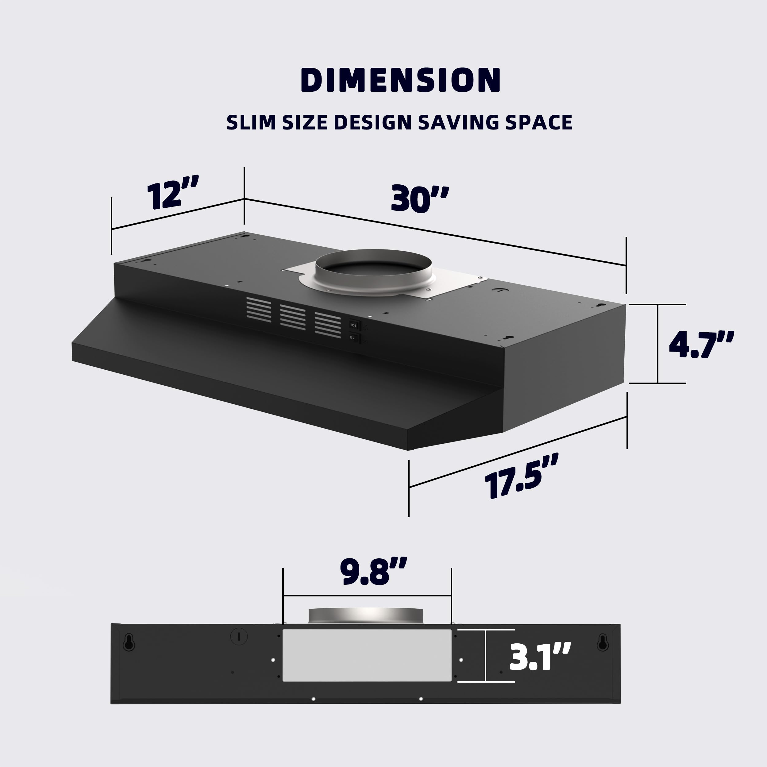 SLIM & SPACE-SAVING:Range Hood Product Dimensions: 29.9 in. (W) x 17.5 in. (D) x 4.7 in. (H). The height of small range hood is designed 4.7 inch, which can effectivly save space and is suitable for compact space and small kitchen, such as condos and apartment.