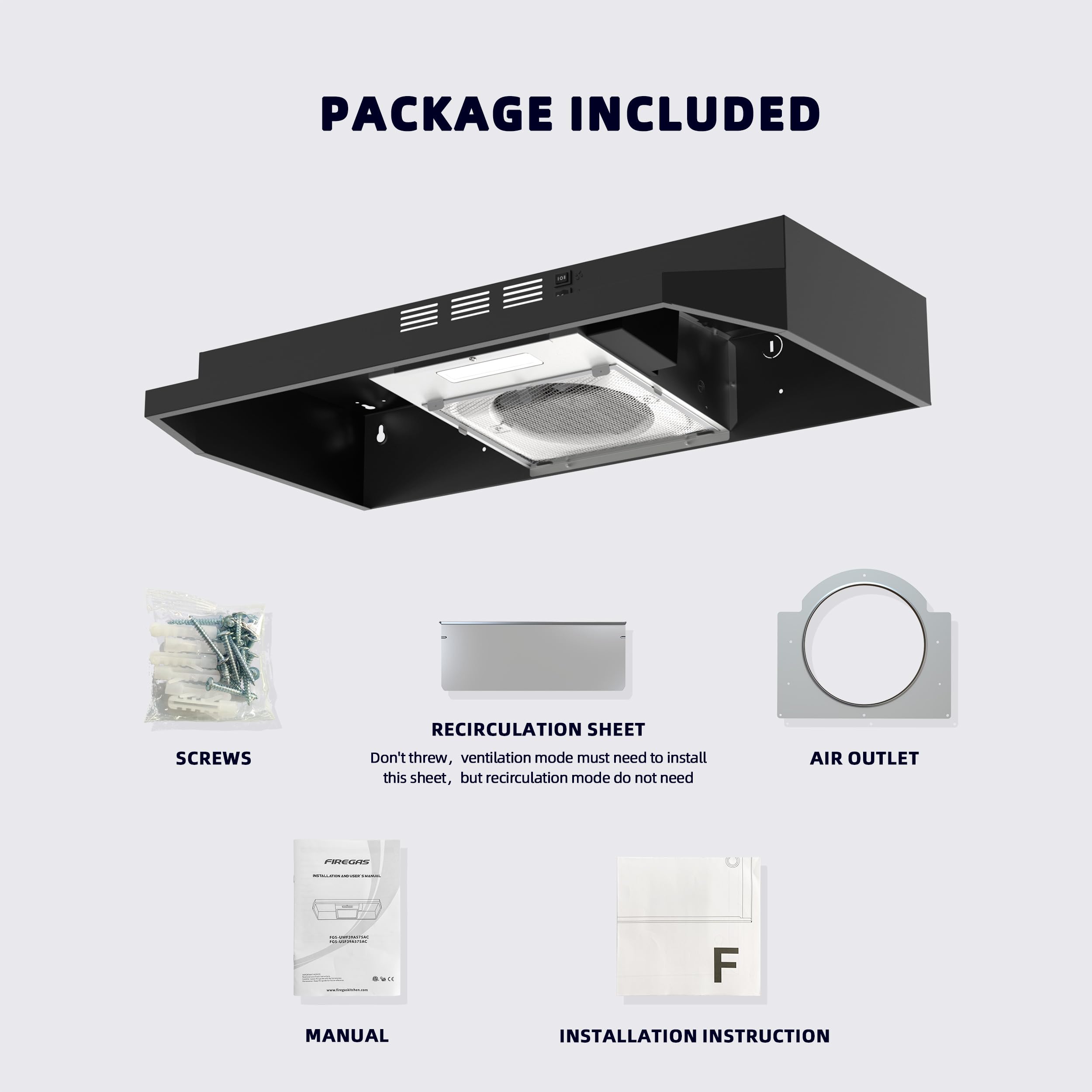 PACKAGE INCLUDES & 1-YEAR WARRANTY: Including a under cabinet range hood, recirculation sheet, air outlet, manual, installation instruction, multi-layer aluminum filter without charcoal filter (charcoal filter sold separately, model: FGS-TF39-LW, asin: B0CH335CR8) and hard-wired without plug (plug sold separately, model: FGS-TF39-DYX, asin: B0CH3454G7). If you have any problems with this stove vent hood, please contact our customer service team at first. We will try our hard to solve customers problem and have a friendly service.