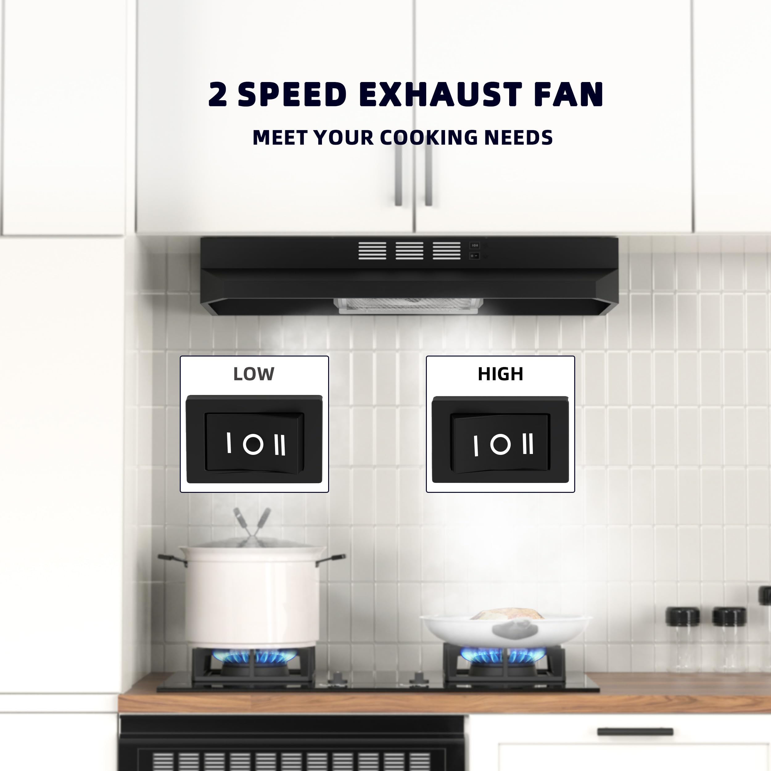 EASY OPERATION & INSTALLATION: The range hood 30 inch has 2 rocker buttons which can simply operate the low/high speed and On/OFF Light. The black range hood is easy to install, includes a installation instruction and manual,and has a installation video to instruct you install.