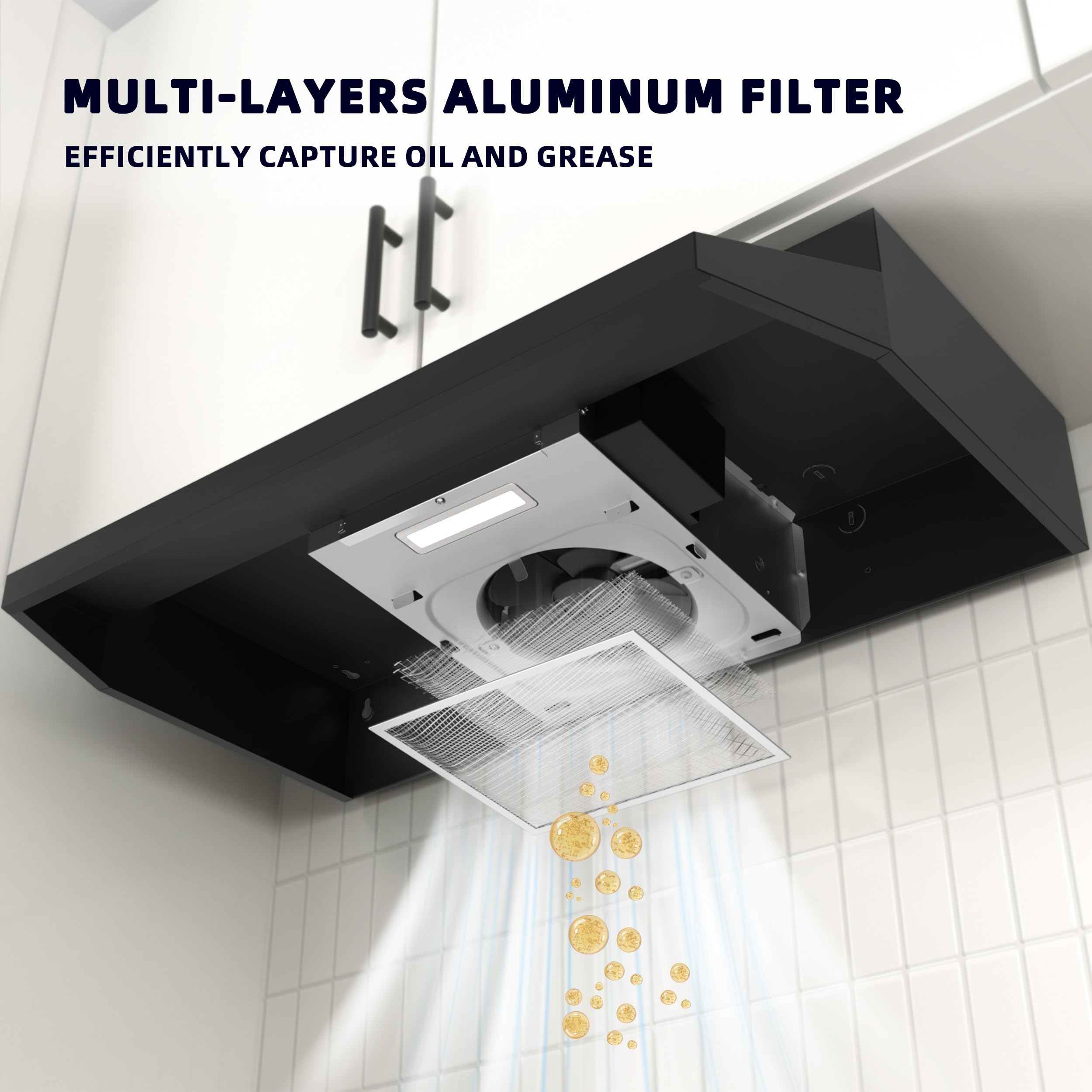 POWERFUL SUCTION & WORK EFFICIENTLY: With 300 CFM Airflow, the Firegas range hoods have 2 speed exhaust fan can quickly remove greese and fumes in your kitchen. The 2W LED Light is energy saving and offer enough brightness to illuminate your cooking area. Quiet operation keeps noise level less than 57dB at high speed. Under cabinet range hood with Multi-layers aluminum filter (without charcoal cotton filter) can filter oily fume.