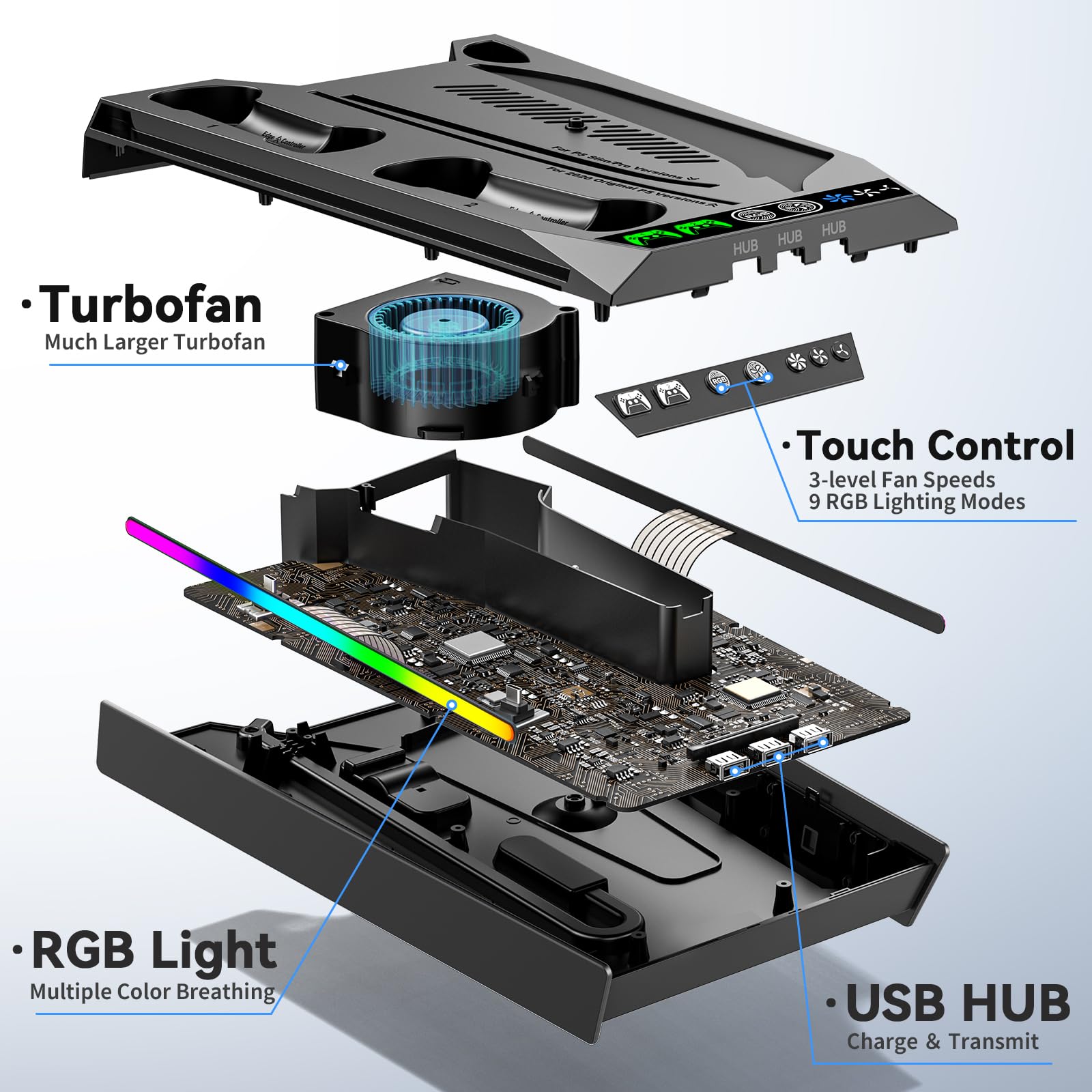 [3 Adjustable Fan Speeds] The enlarged turbo fan in playstation 5 cooling station offers three distinct adjustable speed levels. With a simple and intuitive touch of the button, you can effortlessly switch between the speeds. What's more, it has a convenient feature that remembers your preferred fan mode even after a system restart, making this an ideal ps5 slim cooling station.