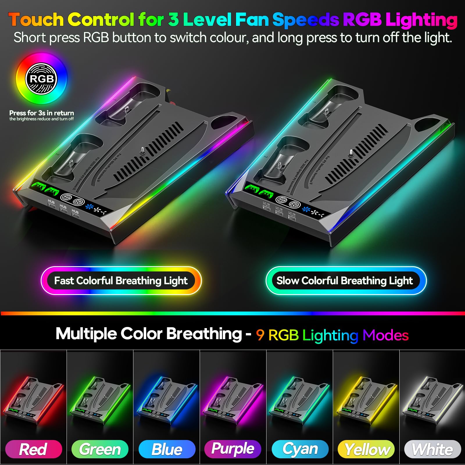 [Fit PS5/Slim/Pro Console] PS5 cooling station is meticulously designed to ensure a perfect fit for PS5/Slim/Pro Console, covering both the Disc & Digital versions. We've thoughtfully included screws to securely fasten the console, providing reliable protection against scratches and ensuring it stays firmly in place on this ps5 vertical stand.