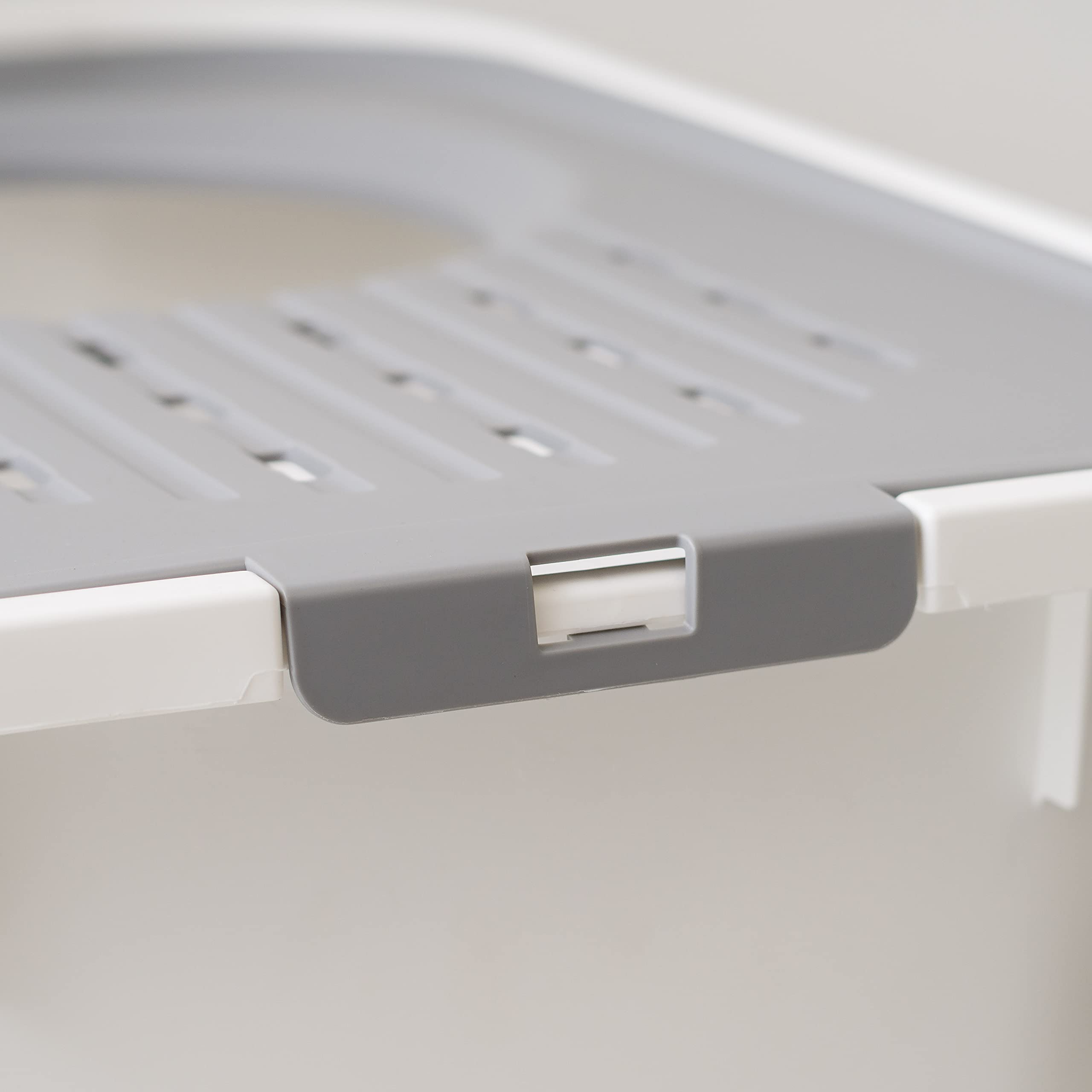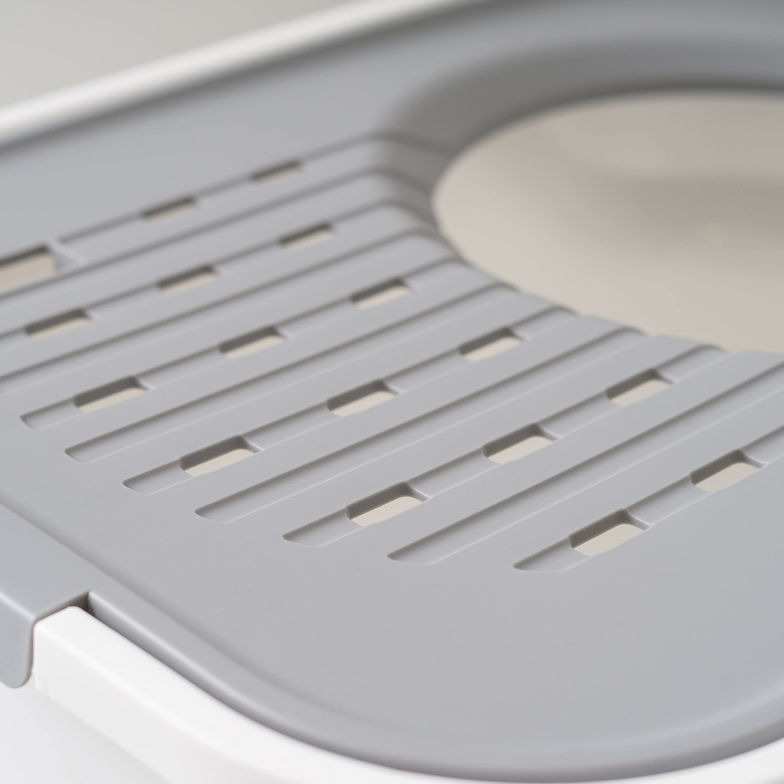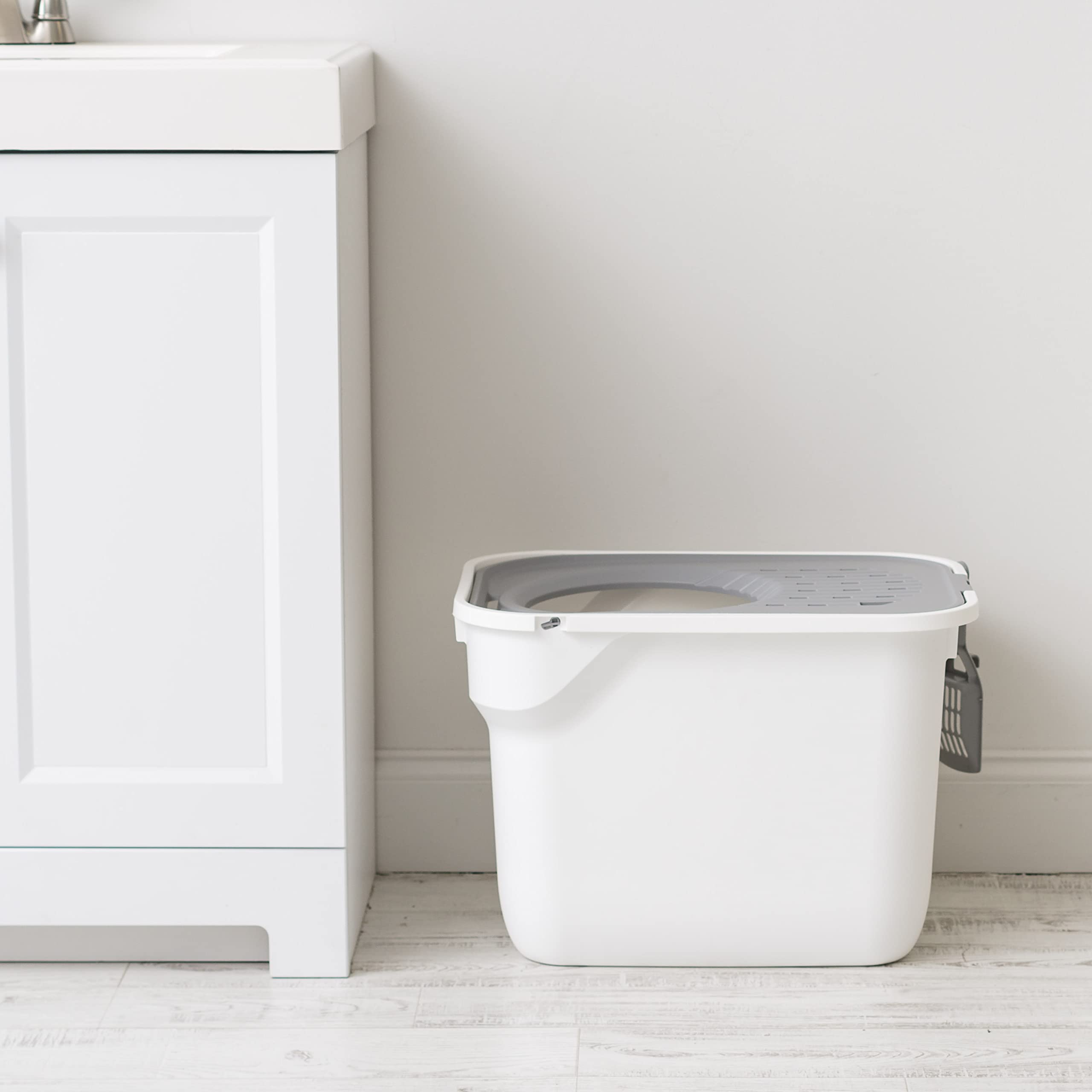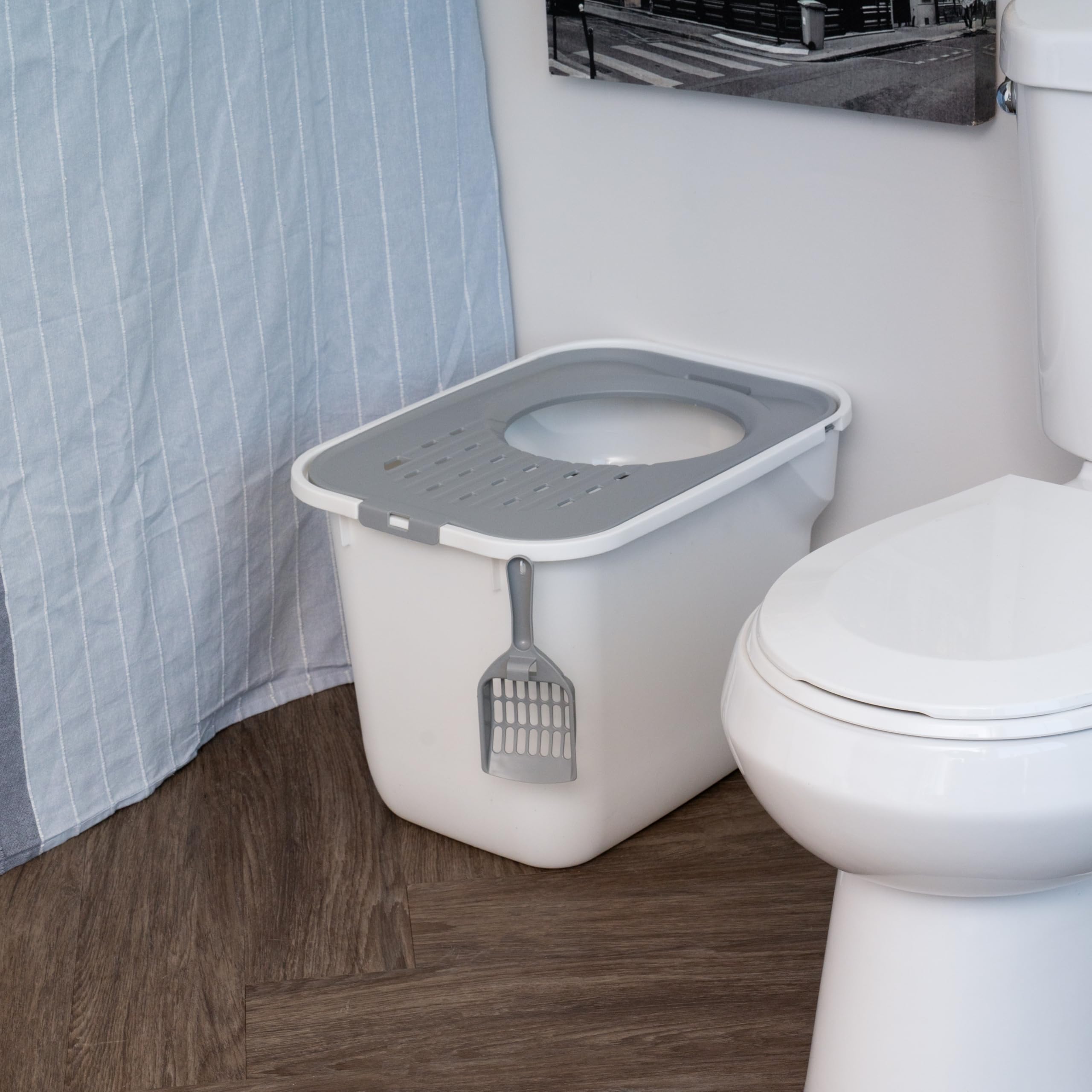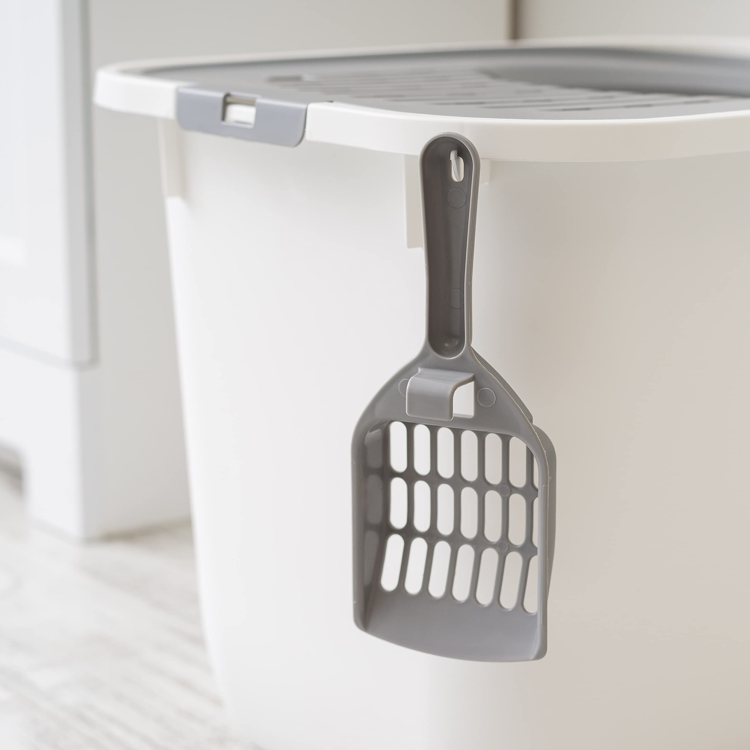 TIDY & ORGANIZED: The grooves in the lid catch lingering litter particles from your cat's paws, preventing spills and keeping your area neat. Plus, the included scoop features a convenient hook for easy storage on the side, ensuring it's always within reach when needed.