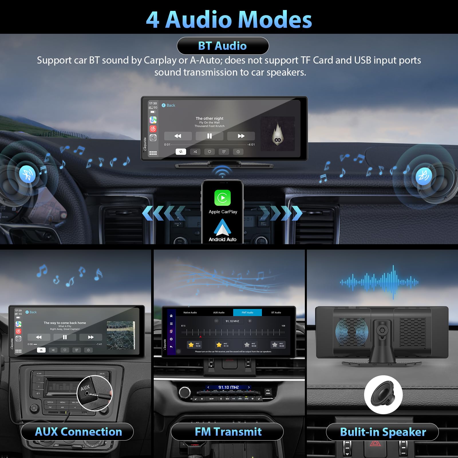 【Multifunctional Bluetooth Chip】Equipped with an upgraded Bluetooth chip, support 2 BT audio modes: 1. The local music of the Carpuride machine and the sound of the app software are connected to the 3-party BT device through "More settings" to play the sound (Not support Carplay/A-Auto). 2. When connected to carplay or android auto, after the phone is connected to a third-party BT device, it can also play sound on the 3-party BT device (Only valid for Carplay/ A- Auto).