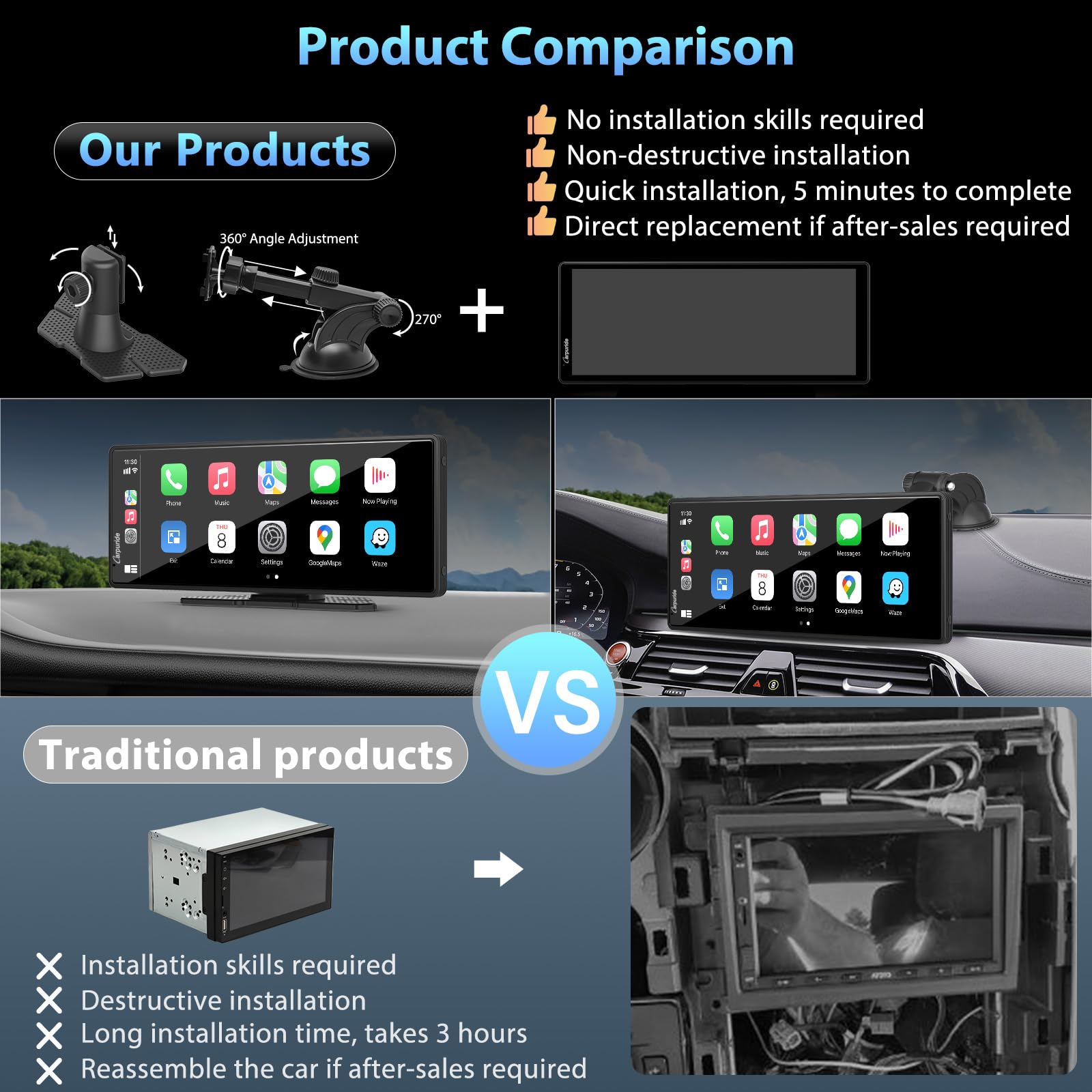 【Easy to Install】Carpuride 9.3-inch car audio adopts C-type power supply, and the output is 5V. If your car is 12V, please use the original CARPURIDE power supply, which can convert 12V to 5V. To avoid voltage. Inconsistency caused by machine smoking! This carplay radio can be firmly fixed on your dashboard with a suction cup lock accessory, or it can be fixed on the windshield with a strong suction cup, and then adjust the height and length according to personal visual habits. The base supports 360° rotation, plug and play.
