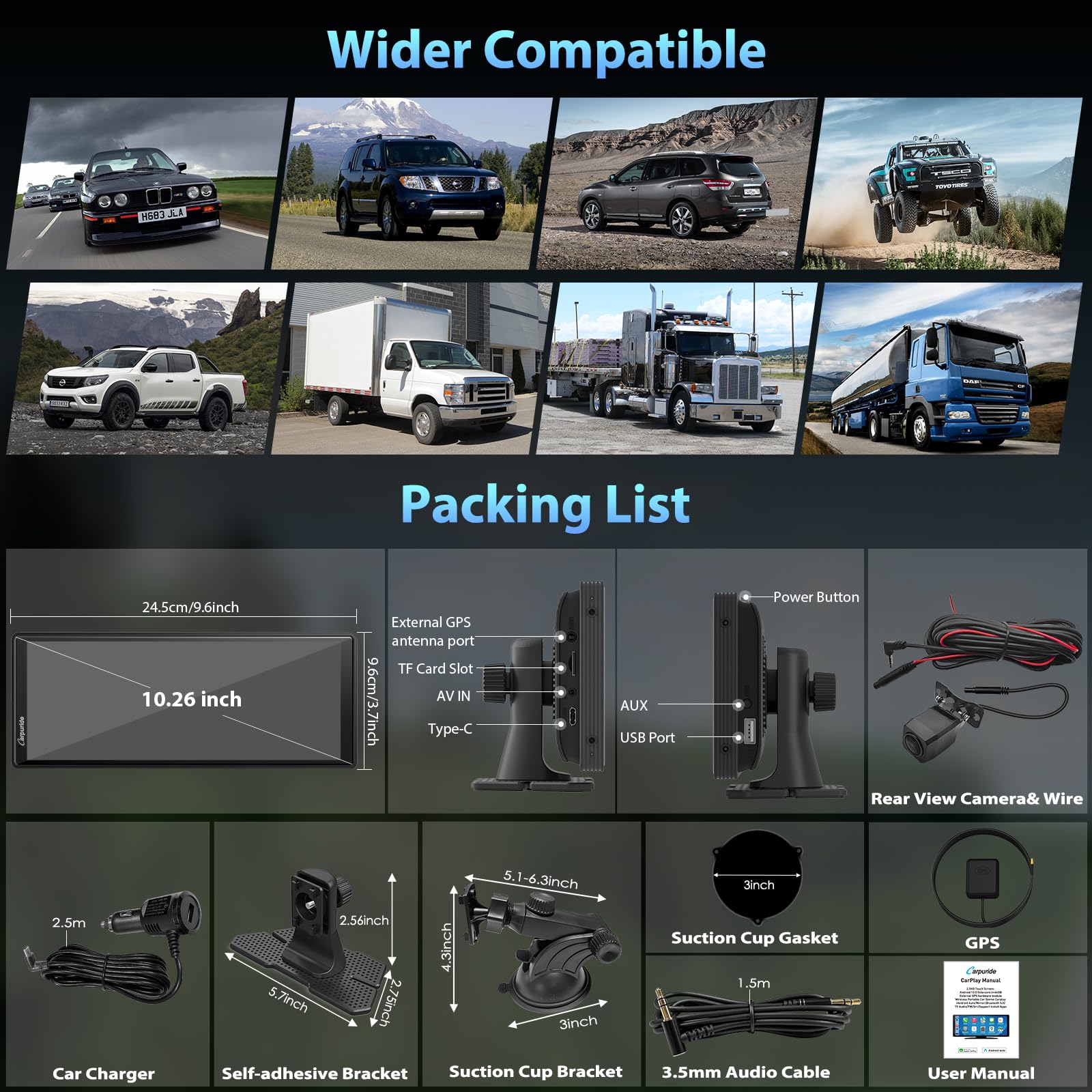 【Packing List 】The entire screen of the CARPURDIE device, including the black border, is 10.26 inches (The inner screen size is 9.3 inches). Support 3.5mm jack rear view camera with an automatic display of image when in reverse. Package includes: 1*W102plus car stereo, 1* W102plus dedicated rear camera,1*adhesive bracket, 1*suction cup bracket, 1*GPS antenna, 1*AUX cable, 1*power cable, 1*instruction manual