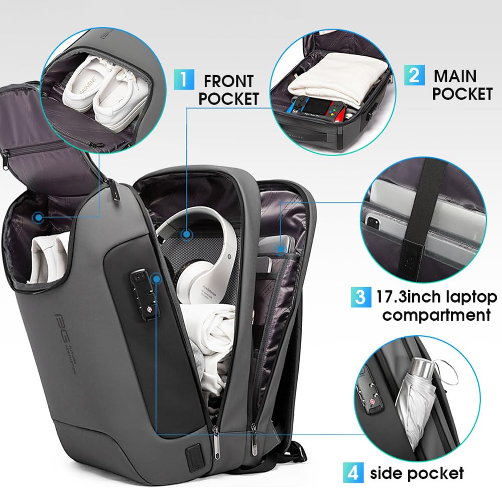THREE POCKETS WITH MORE FUNCTIONS: Bange upgraded backpack has three separted pockets. The front one can fit one pair of shoes or other personal items, such as power bank, glasses, head set and so on. Per the middle pocket, there is a TSA lock, which can protect your valueable item. The separated laptop compartment can hold one 17.3 inch notebook, and our friendly design can be shockproof and waterproof. It's your best partner during business trip.