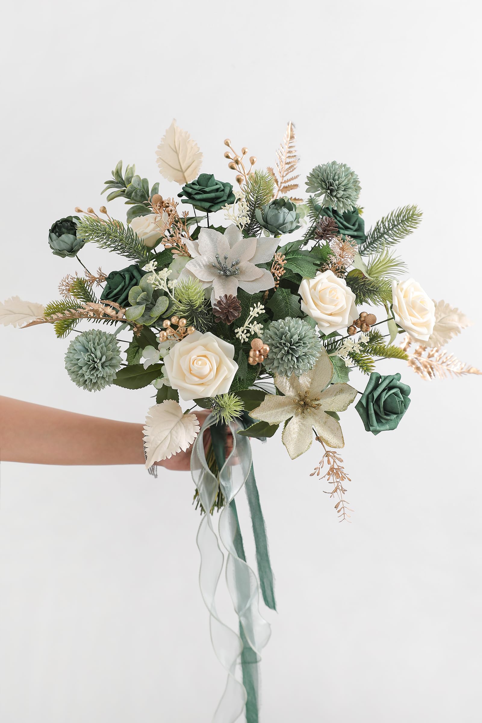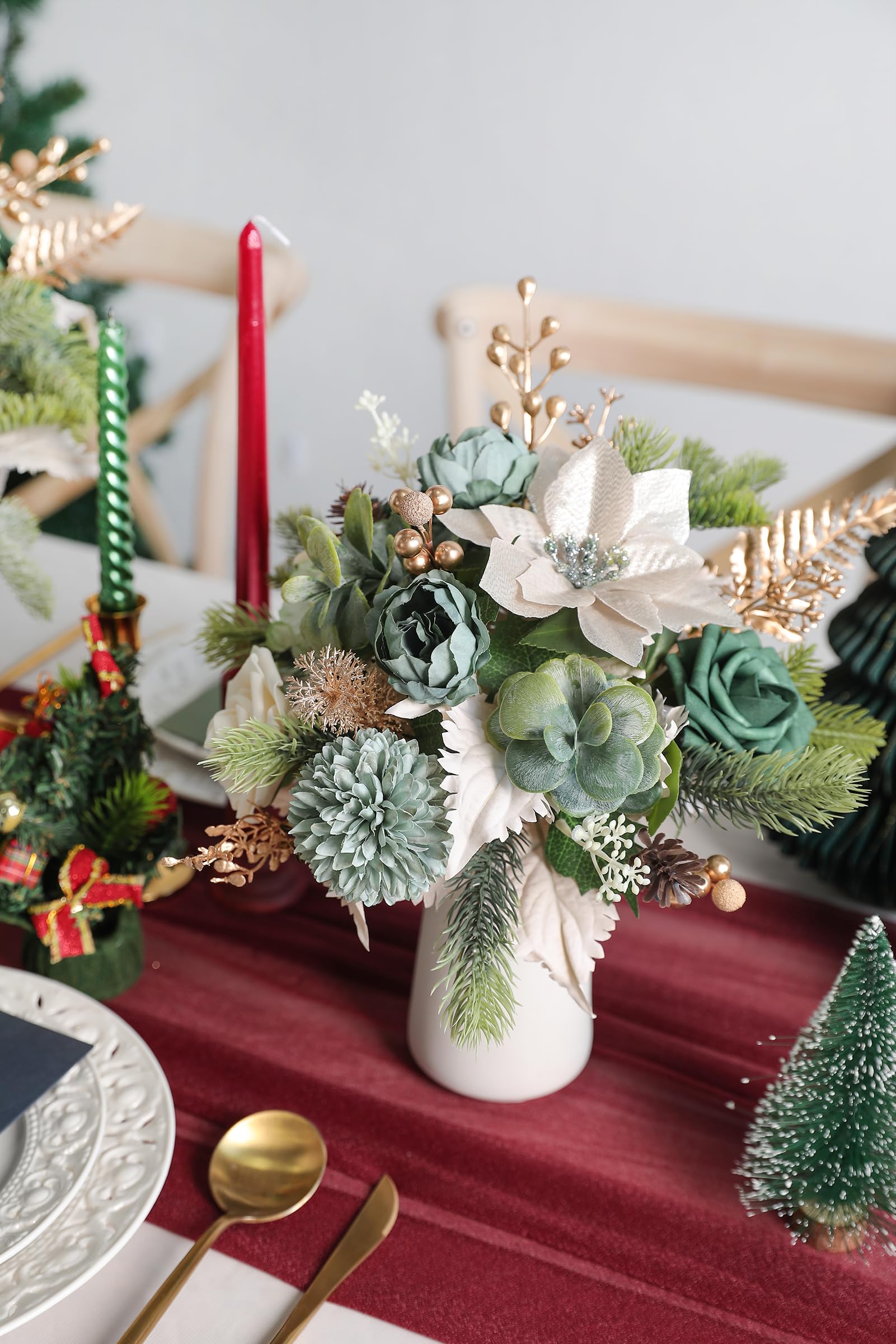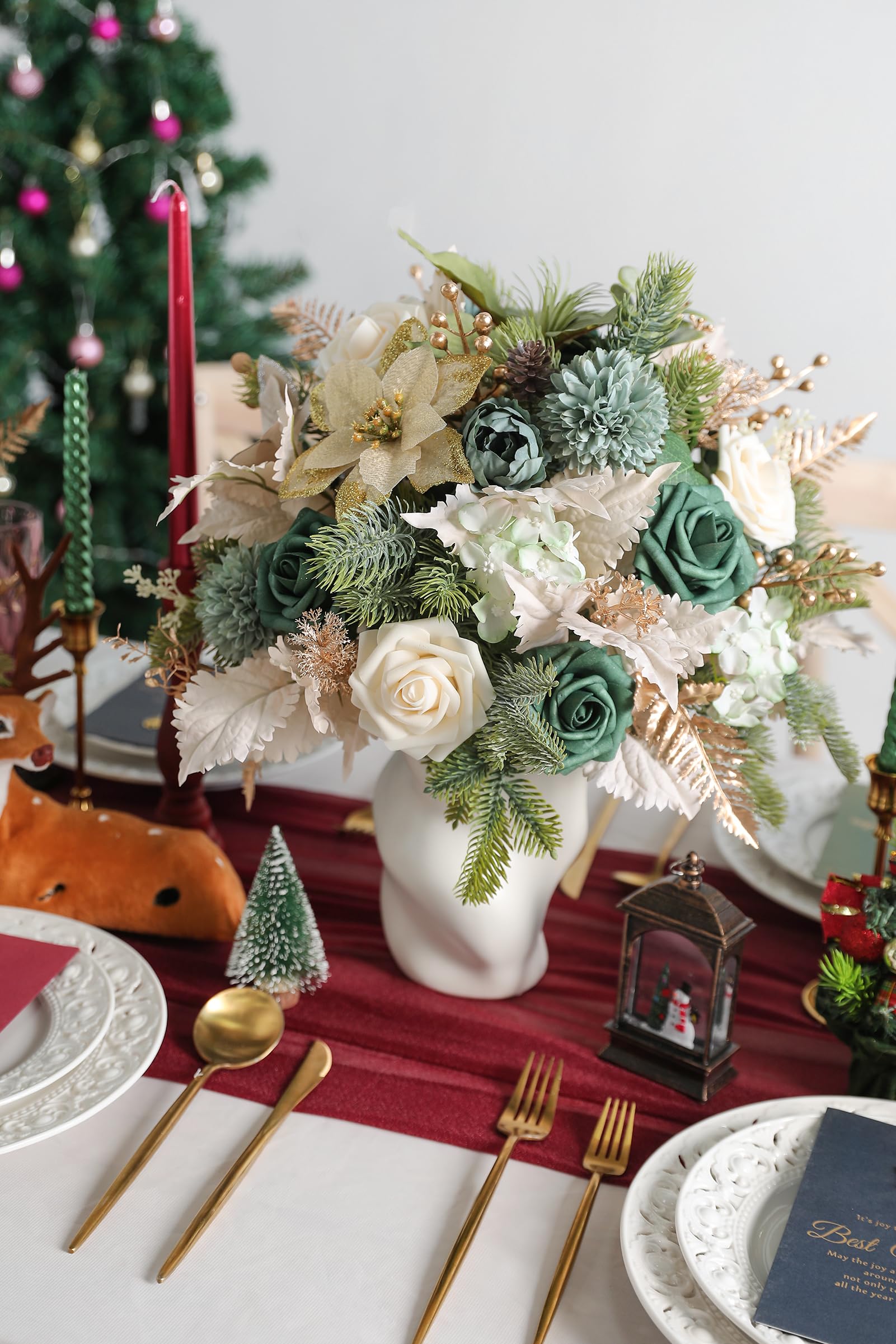 【Package include】18pcs Flower head+15pcs gold accessories+28pcs Greenery leaves and other accessories.There are plenty of flexible plant stems for DIY.Package included Foam roses/Christmas flowers/golden berries/Persian leaves/pine needles and other Christmas ornaments.