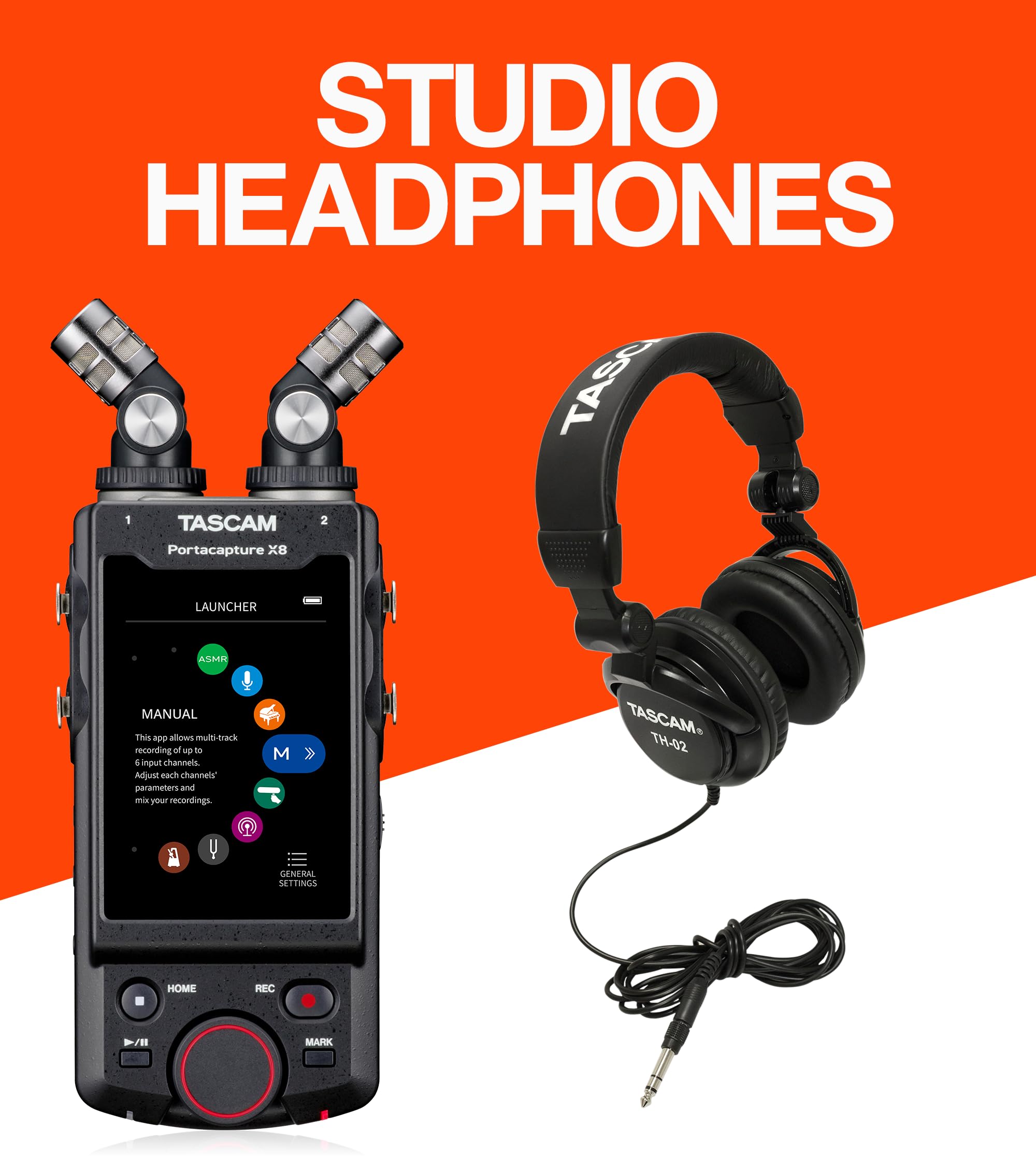 The TASCAM Portacapture X8 has an intuitive launcher system using a 3.5-inch color touch panel display. Recording applications such as basic multi-track recording, music, voice (interviews, vlog), field recording, ASMR and more. Supports up to 192kHz/ 32-bit float point recording. With the TH-02-B headphones, you can listen to your pristine quality recordings. The closed-back design and circumaural earcups maximize isolation, making TH-02-B ideal for audio monitoring.