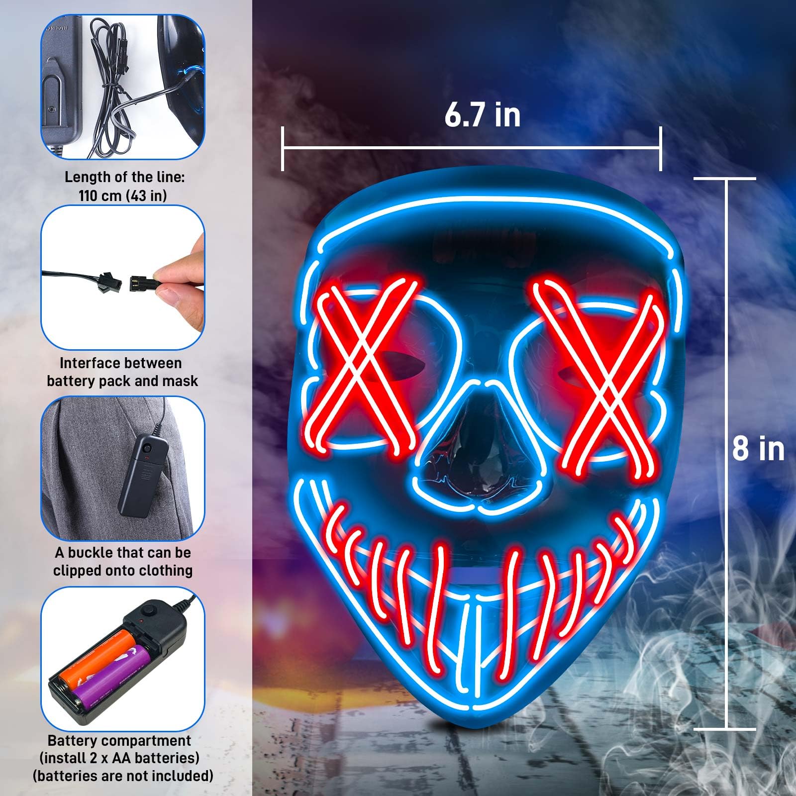 Portable Design: The light up mask controller conveniently clips onto your purge costumes, enabling seamless switching between lighting modes. Simply insert 2 AA batteries (not included) of glowing