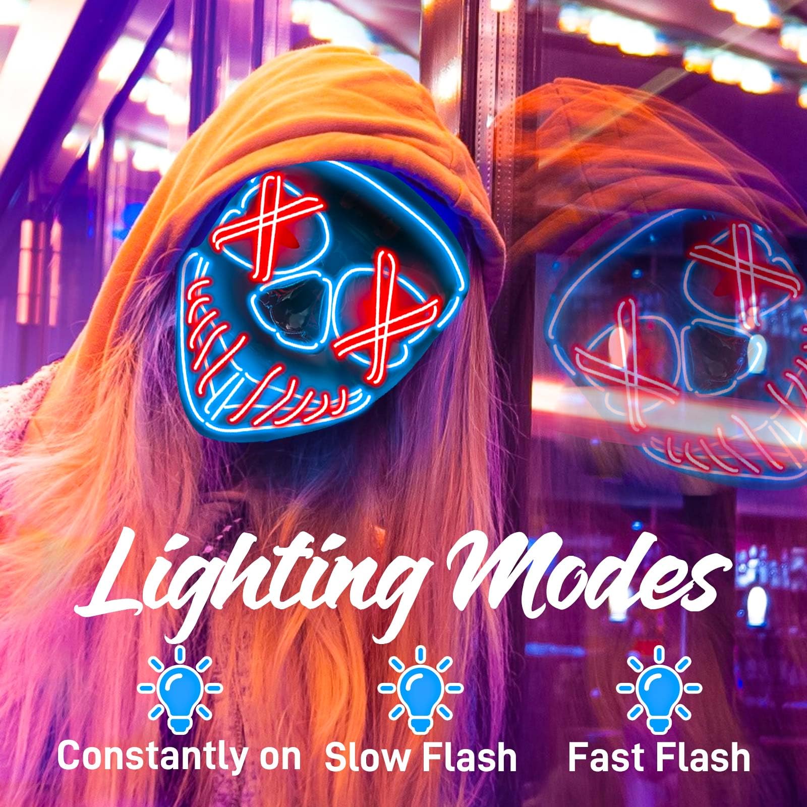 3 Light Modes Design: The led mask has 3 lighting modes, steady on, slow flash, and fast flash. You can choose different light modes according to scene requirements and bring the ultimate fear in dark places