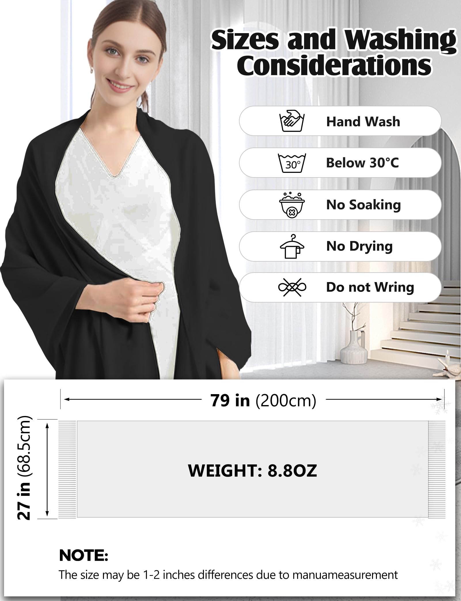 Standard Size & Medium Thickness: Approx 70×200cm (27×78in), ±3cm error for manual measurement. Medium weight, temperature-resistant 14°F-41°F, all-season use. Twice softer than cotton—warm, breathable, multi-use as scarf, head wrap, shawl, blanket, etc.