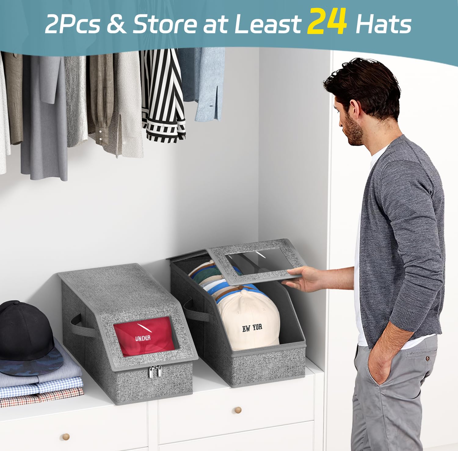 【Holds up to 24 Hats】: Size of baseball cap storage: 17"L x 8.7"W x 6.7"H, each well-designed hat organizer can efficiently accommodate up to 12 hats, 2 pcs hat cases can hold 24 hats in total, eliminating the frustration of messy hat piles;
