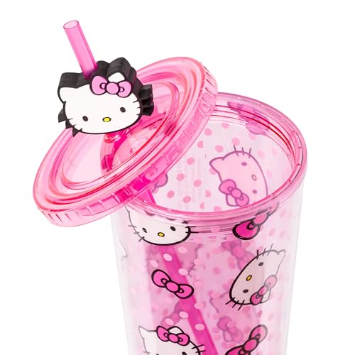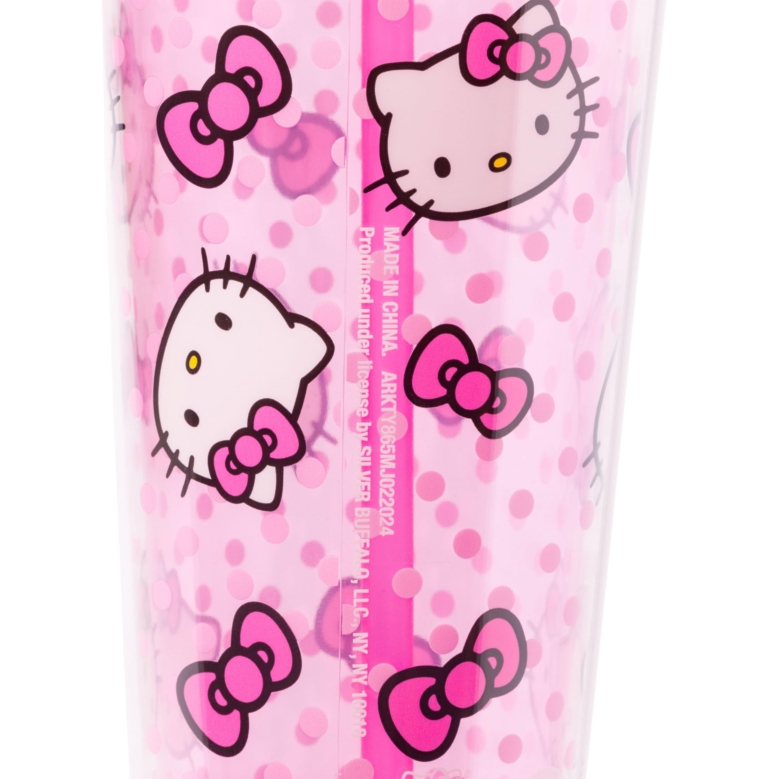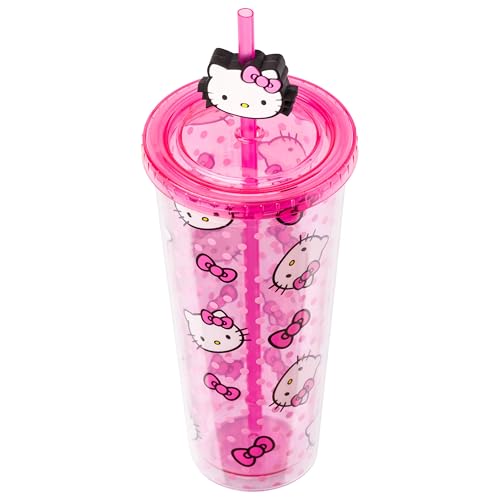 HELLO KITTY COLD CUP: This cold cup features an adorable pattern featuring Hello Kitty and pink bows. Cold cup comes with a pink lid and straw. Straw has a topper featuring Hello Kitty’s cute face.