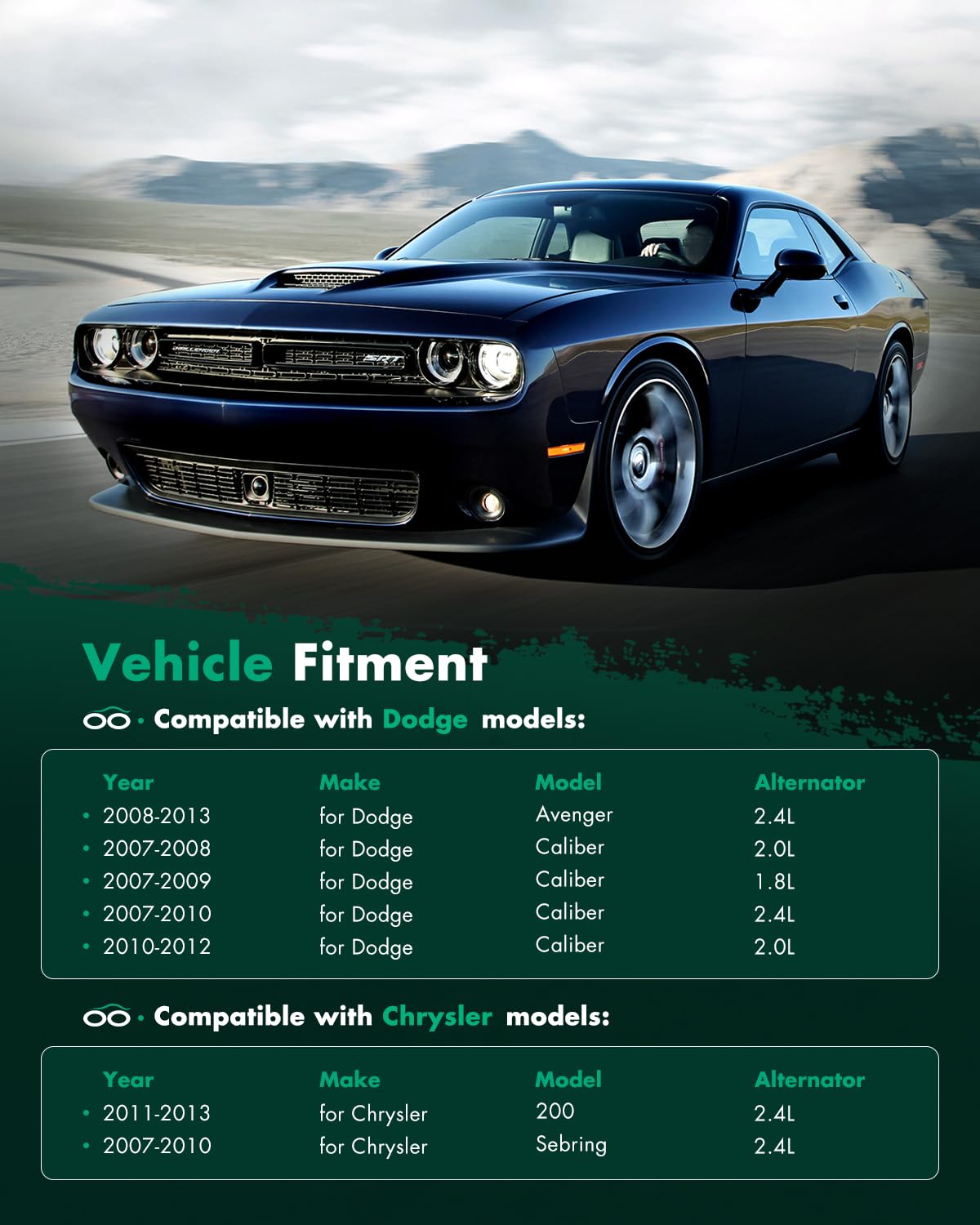 【Alternator for Dodge】- Automotive new alternator replacement for Dodge for Avenger 2008-2013 L4 2.4L 2360cc 144cid, for Dodge for Caliber 2007-2009 L4 1.8L 1798cc 110cid, for Dodge for Caliber 2011-2012 L4 2.0L 1998cc 122cid VIN A, for Dodge for Caliber 2007-2010 L4 2.0L 1998cc 122cid, for Dodge for Caliber 2009-2011 L4 2.4L 2360cc 144cid VIN B, for Dodge for Caliber 2007 L4 2.4L 2360cc 144cid VIN K, for Dodge for Caliber 2008 L4 2.4L 2360cc 144cid VIN K; VIN F