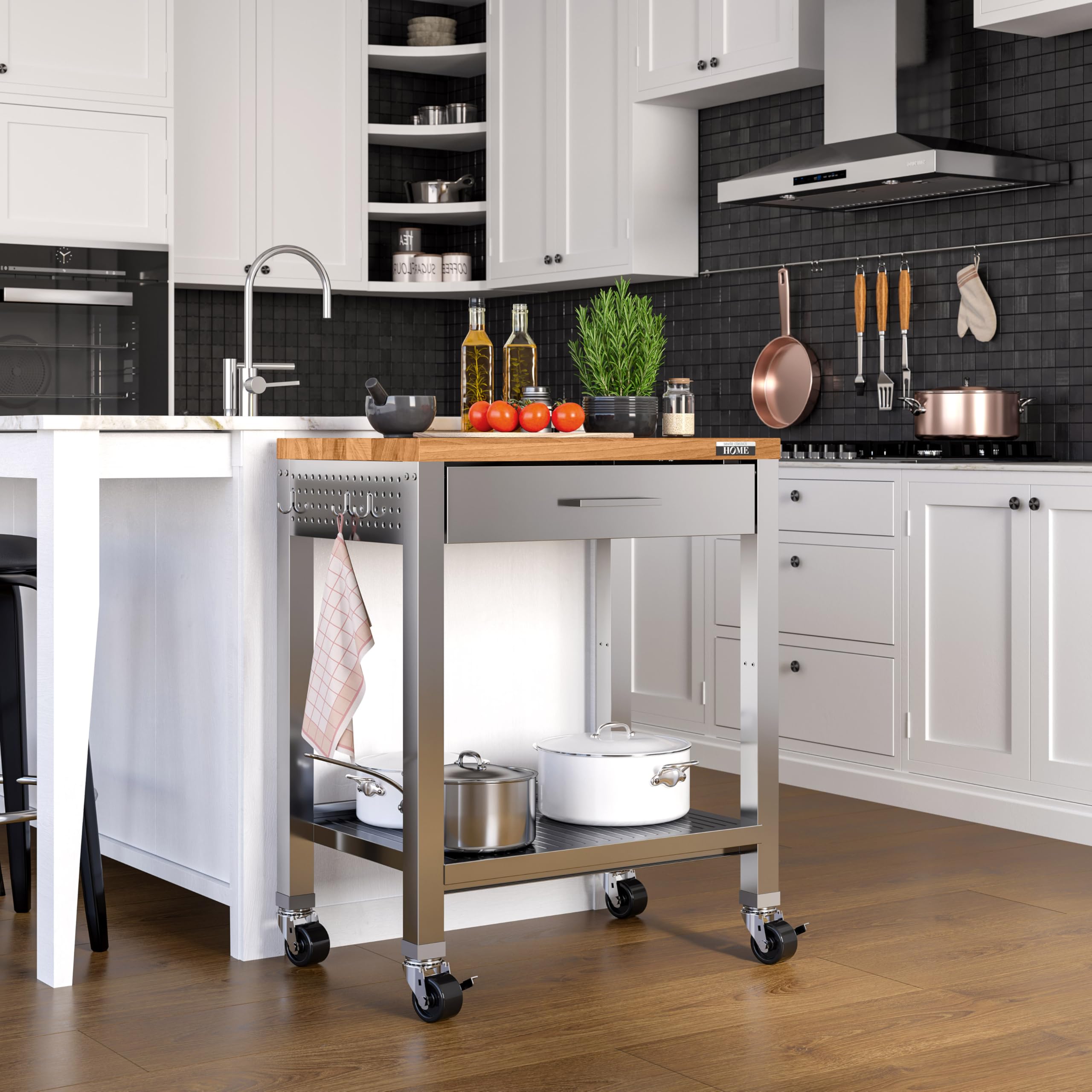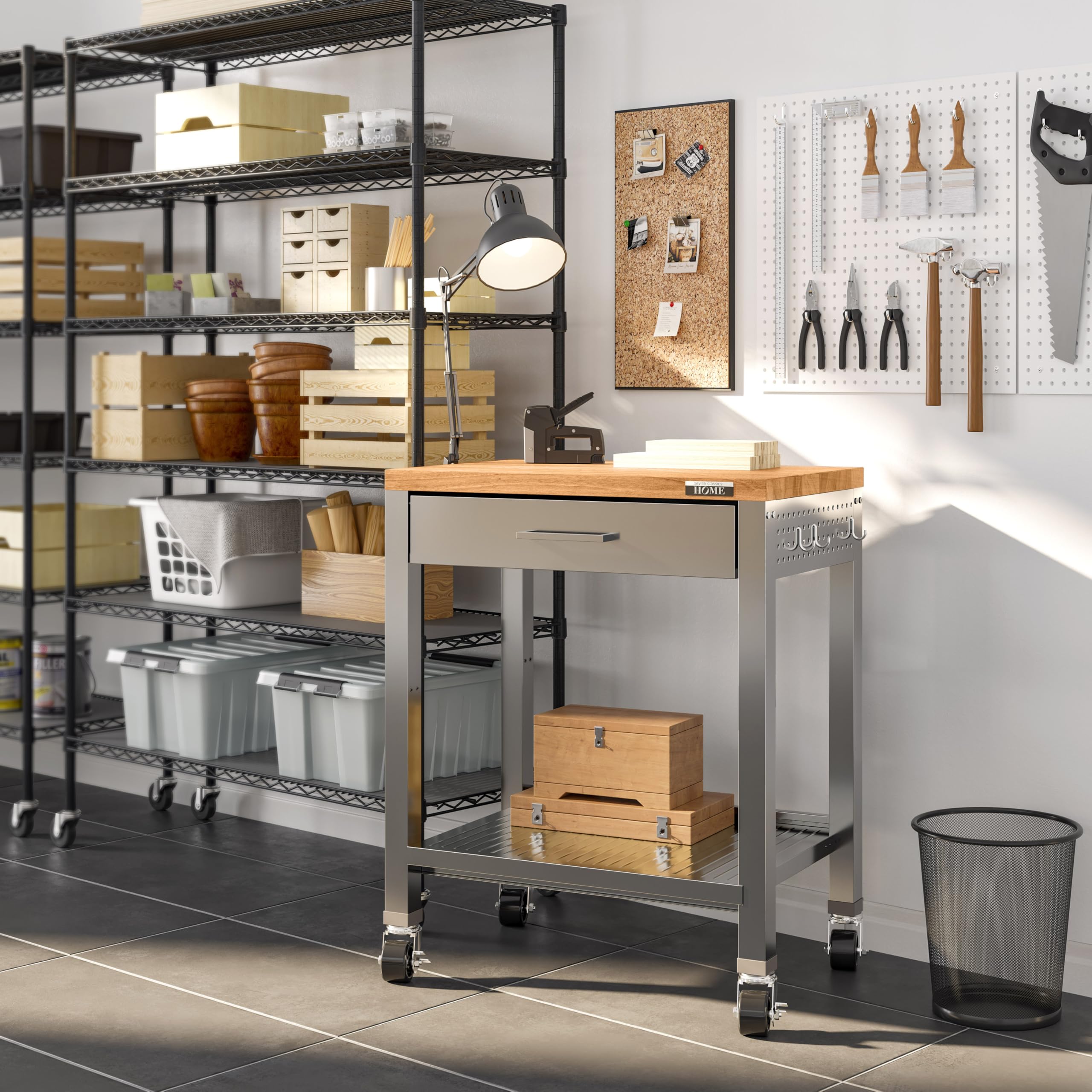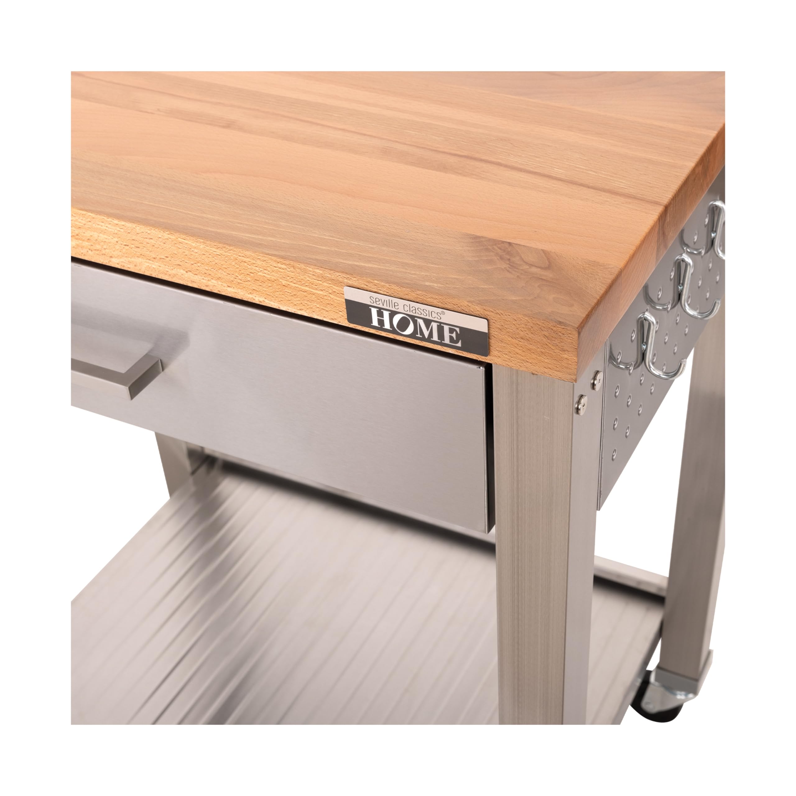 Upgrade your kitchen and workspace with the premium Seville Classics Stainless-Steel Worktable Cart with Solid Wood Top. Crafted from commercial-grade stainless steel for enhanced durability and strength in both residential and commercial settings. The 1.5" thick solid wood top, coated with polyurethane, provides a smooth and resilient surface for various tasks. The UltraGuard® coating on the stainless-steel frame and drawer front minimizes fingerprints and smudging. Additionally, the cart features pegboard sides equipped with six removable hooks providing additional storage and organization options. This conveniently mobile design features four 3" rubber wheels, including two locking ones. This high-quality cart is ideal for use in kitchens, craft rooms, garages, offices, warehouses, classrooms, hotels, restaurants, and gyms.