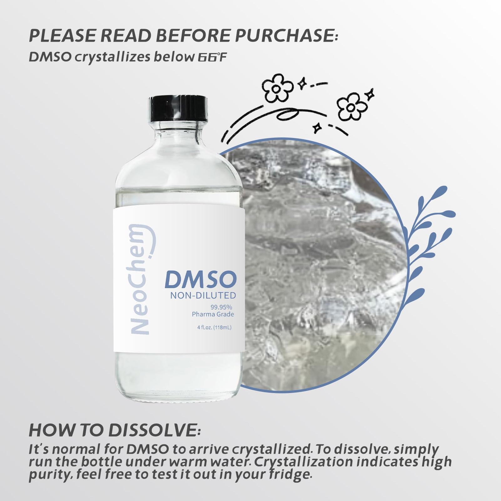 Crystalize at 64 degrees FahrenheitโDMSO may arrive as a solid that looks like shattered glass inside the bottle. This is a sign of high purity. To dissolve, simply place the bottle in warm water only for several hours to dissolve. Do not use boiling water or put in a microwave.