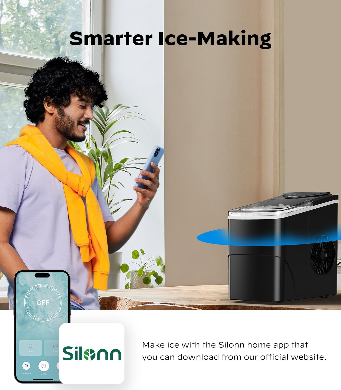 Control Using the Silonn App: Take full command of your smart countertop ice maker using the Silonn mobile app. Connect and monitor your ice maker to start or stop ice production, adjust ice cube size, and receive notifications when the water needs to be refilled.