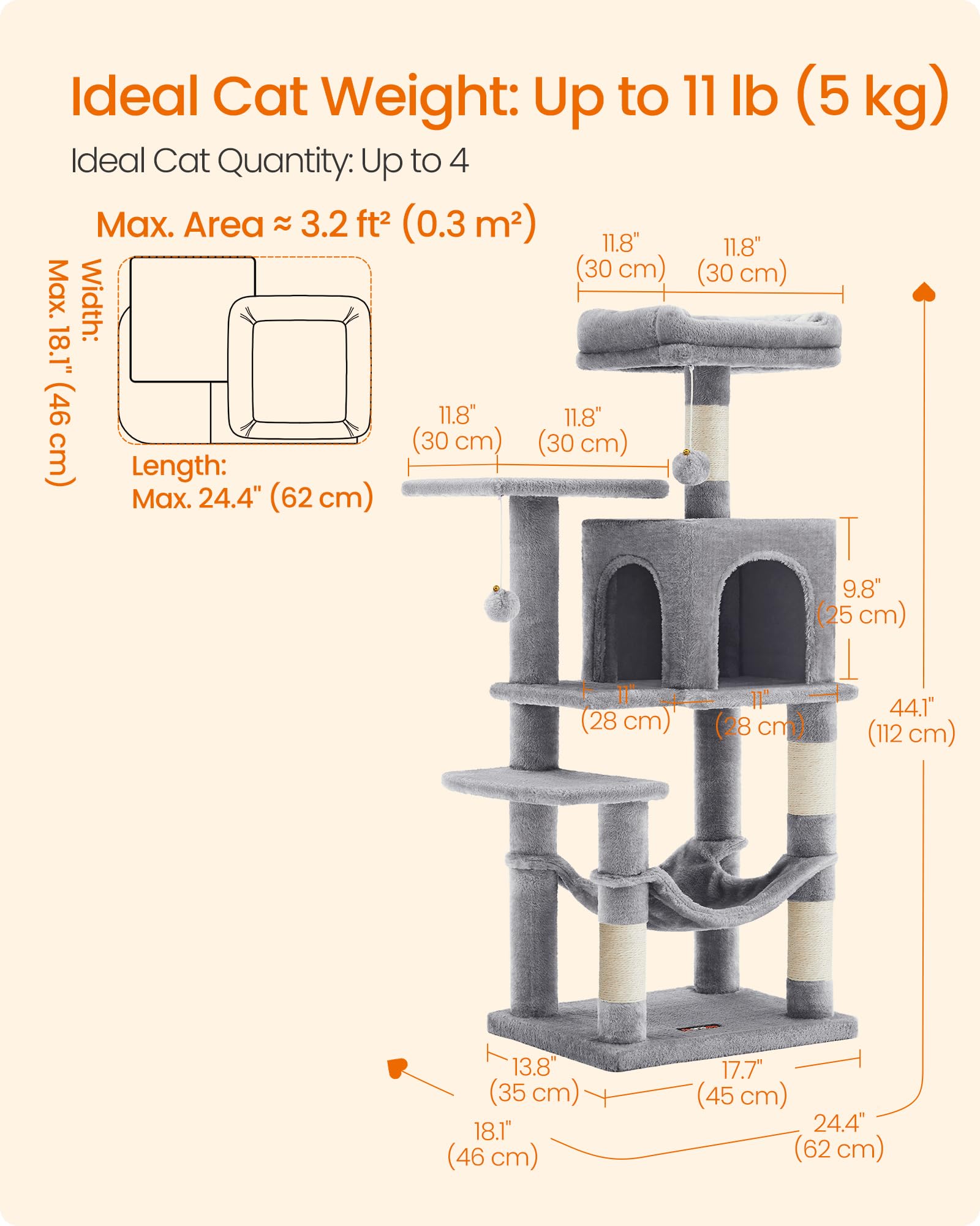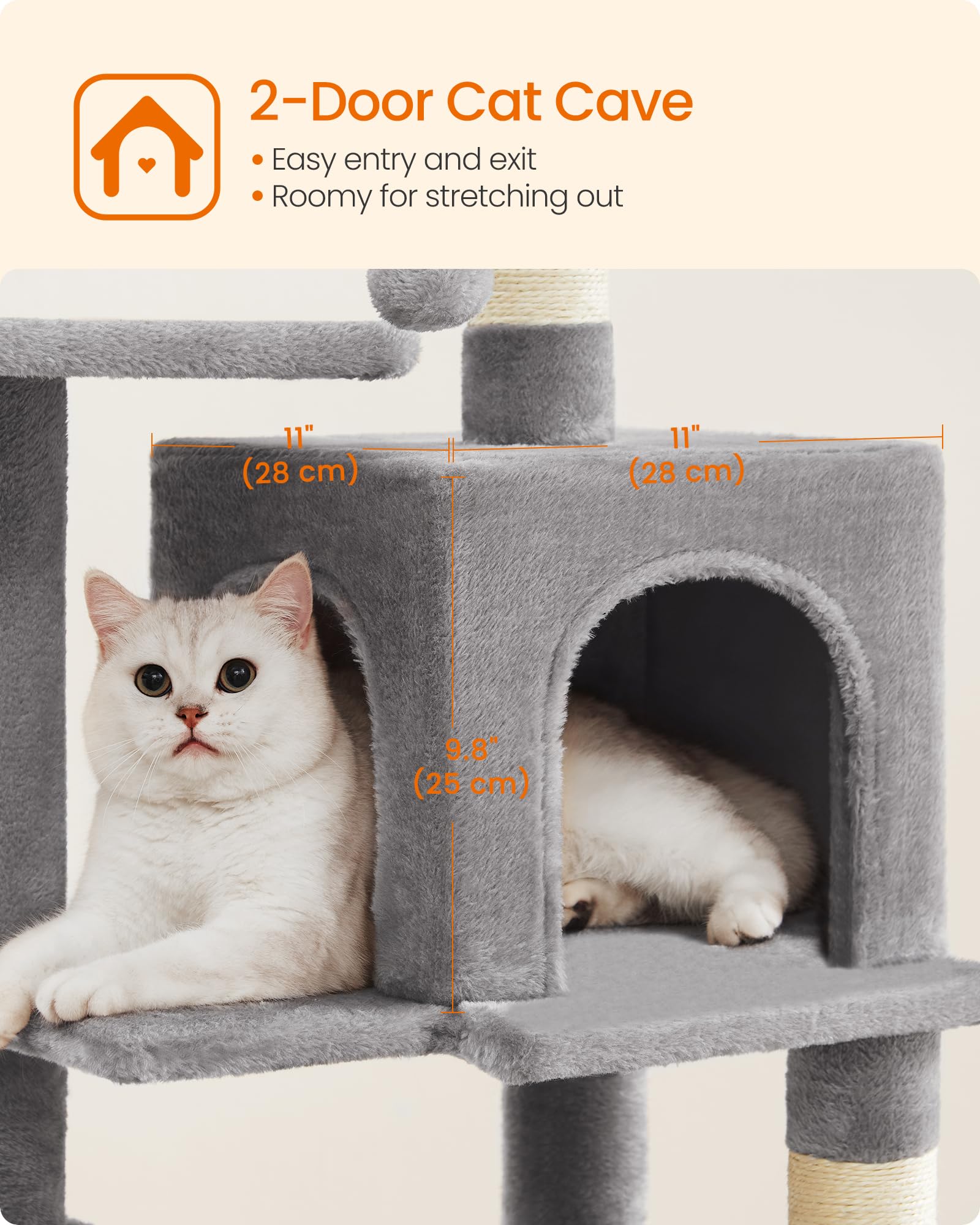 For Multi-Cat Households: Featuring 2 top perches and a comfy cat cave, this cat tree offers multiple cozy places for each of your little furballs to nap and relax