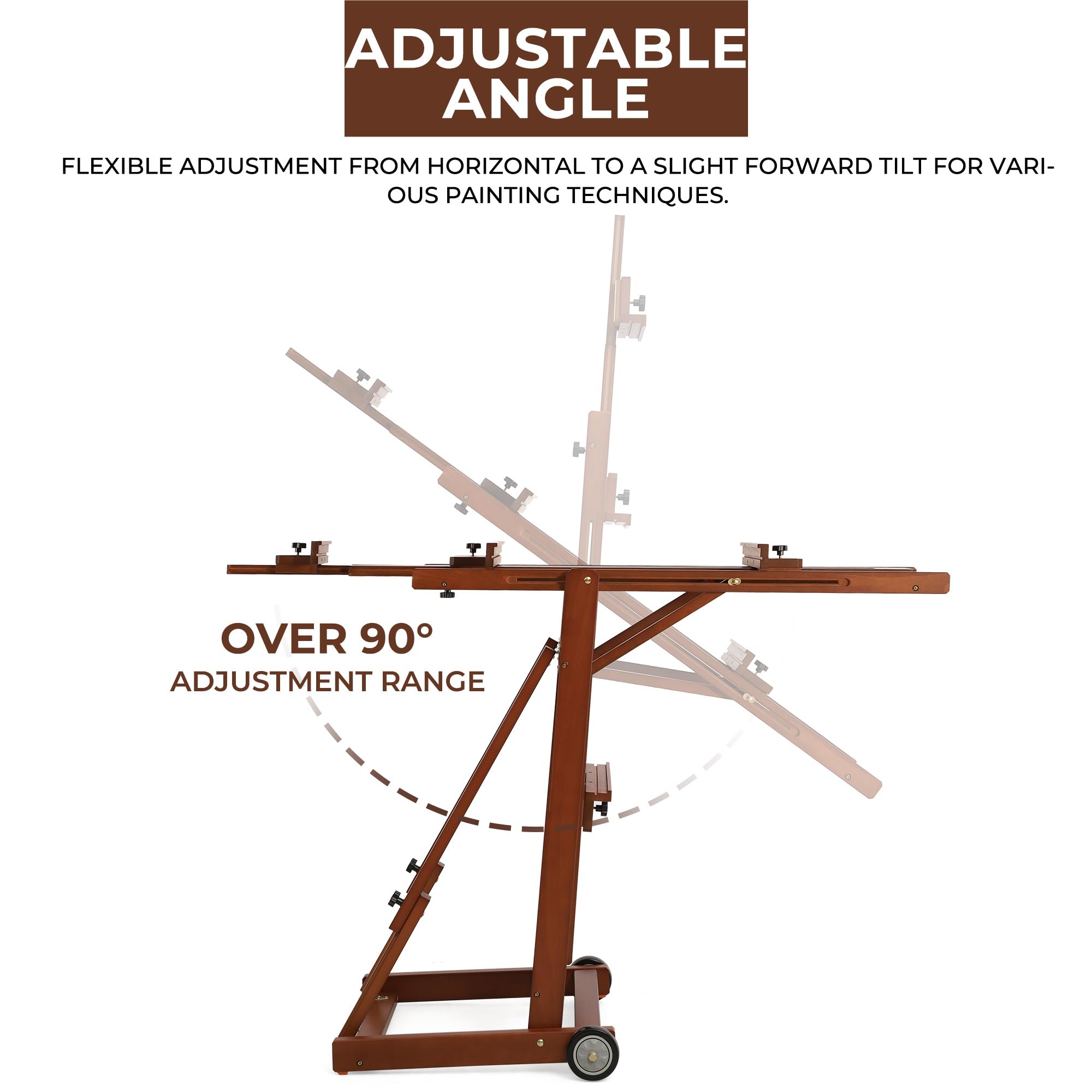 TILTS FLAT & FOLDABLE DESIGN: The easel stand adjusts from a slight forward tilt to a fully horizontal position—ideal for watercolors, pouring, pastel, acrylic, oil or other techniques. You can also fold it down compactly to save space when not in use.